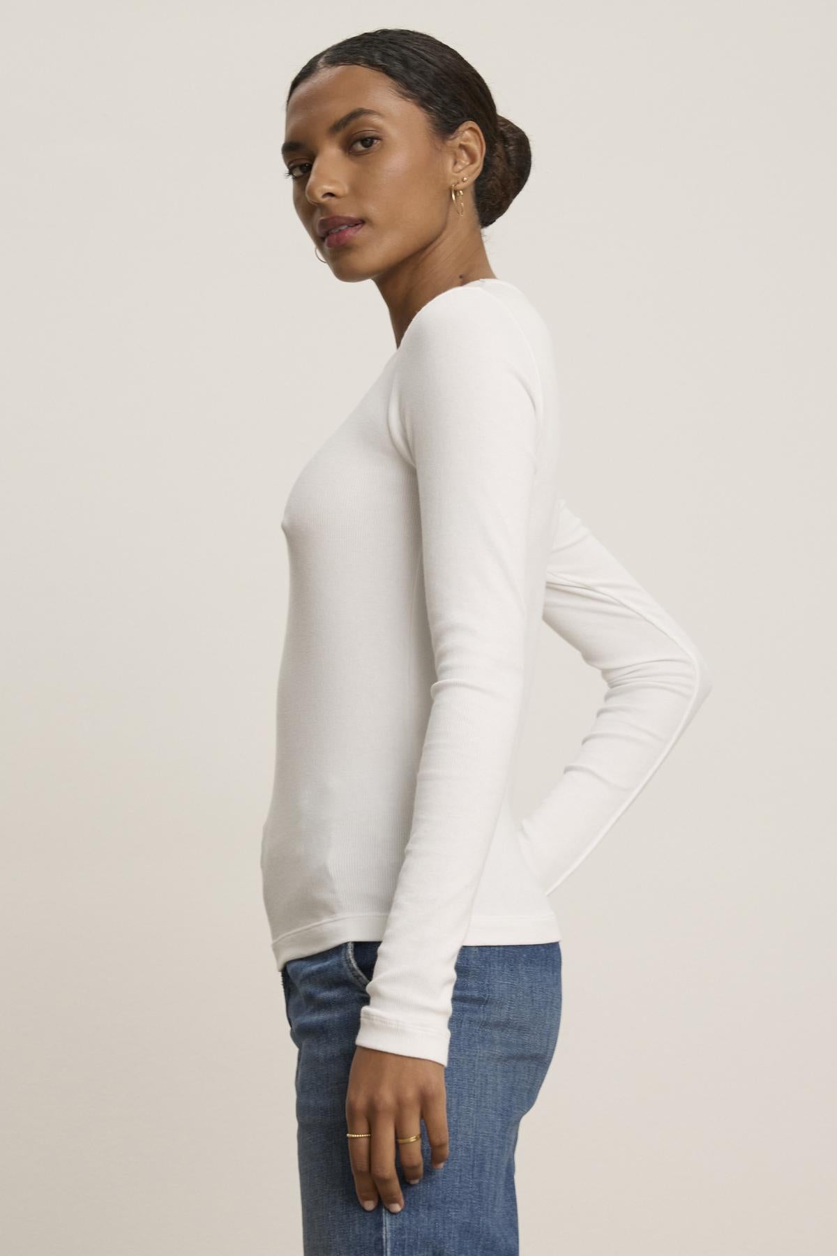 This modal rib feels super soft against the skin and is designed with a slimmer fit so it can effortlessly layer under knits or a blazer. Featuring a neck binding with a flat stitch finish for ultimate comfort and double stitch cuffs and hemline. Versatile, chic and truly timeless.