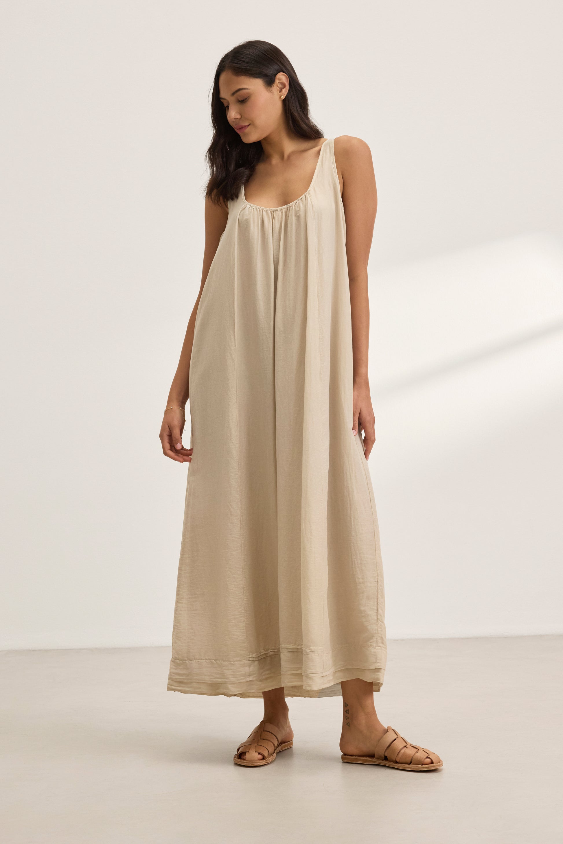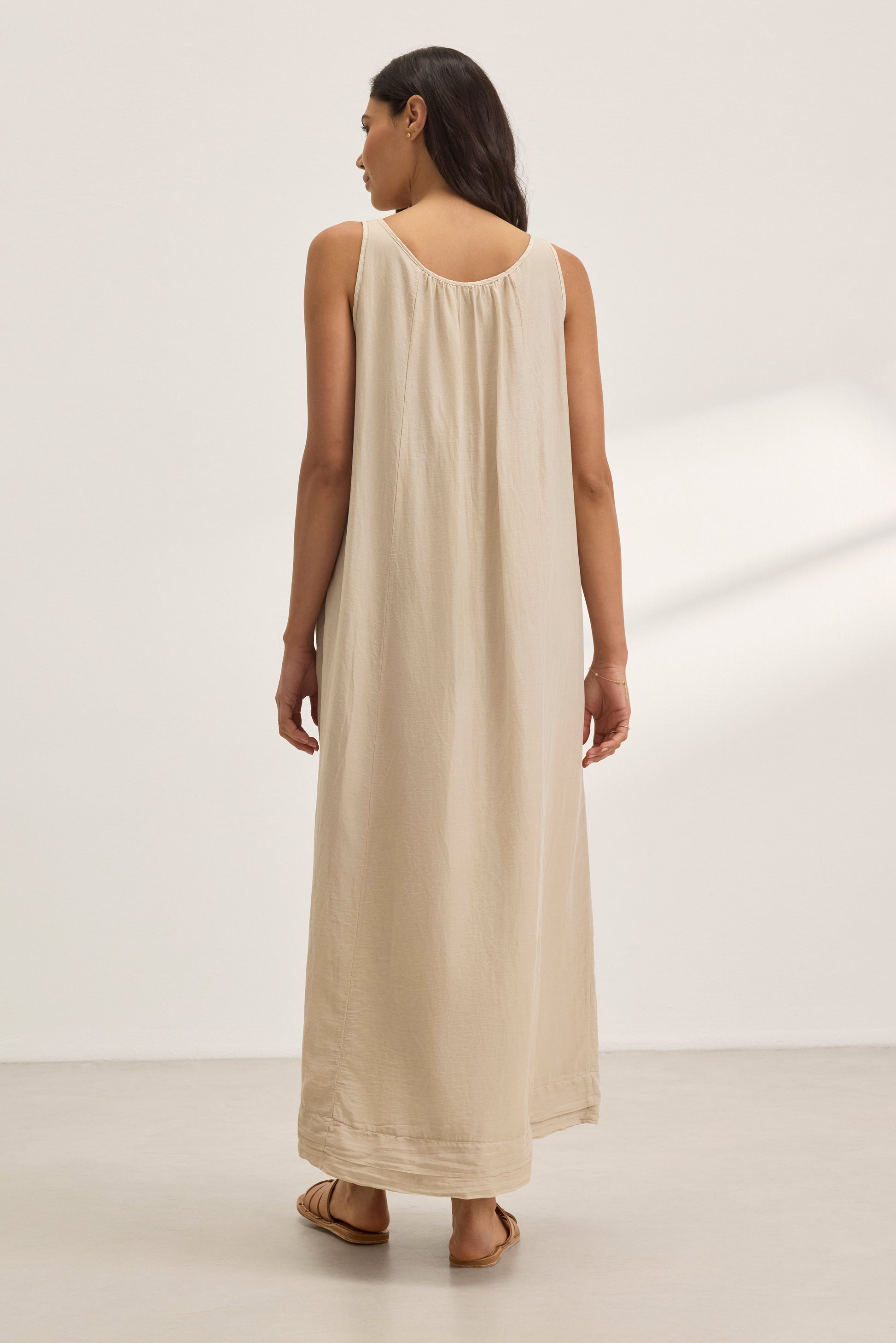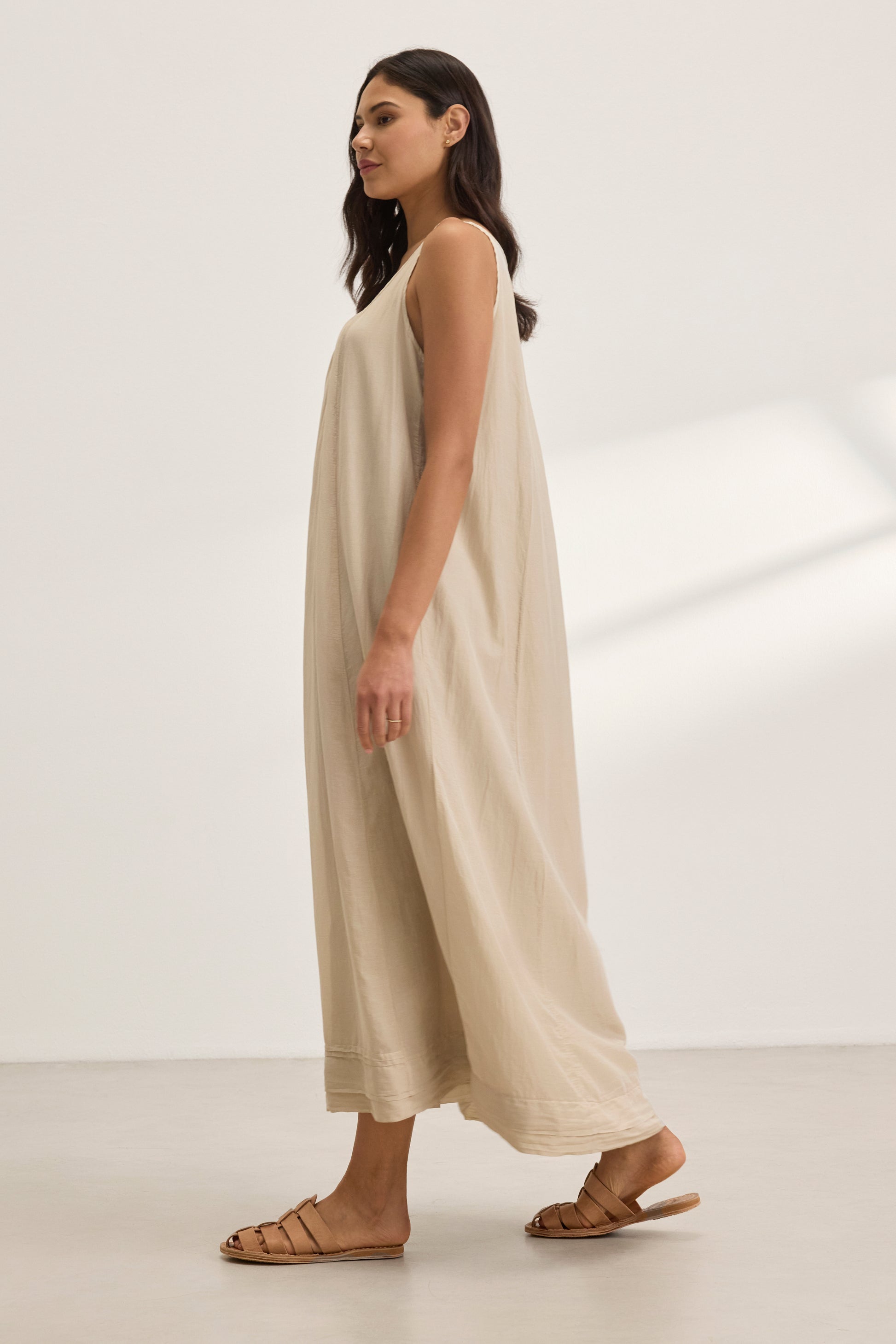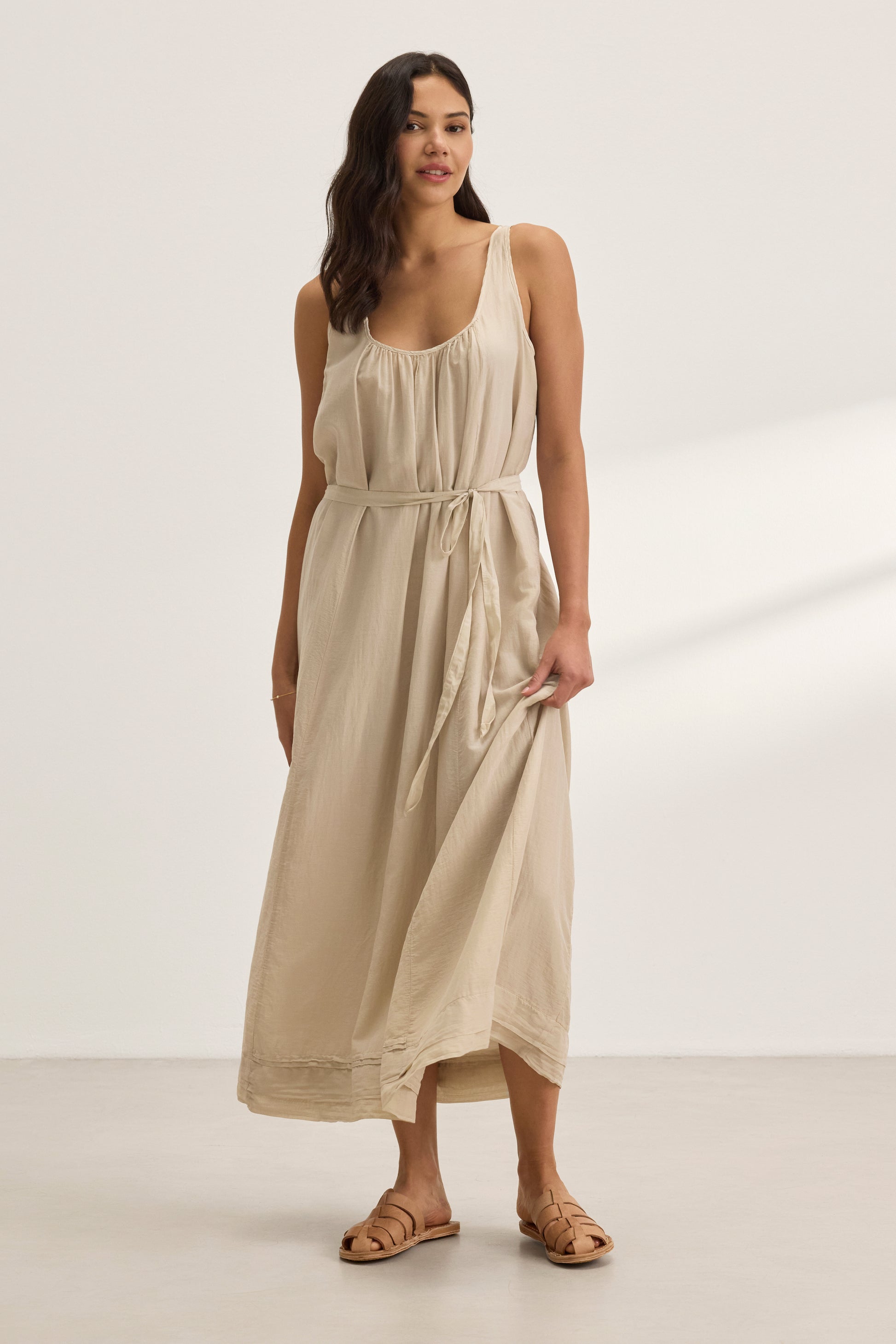 Crafted from silk cotton voile with a subtle sheen, this maxi dress offers an effortless drape and airy feel. Designed with a scoop neckline, sleeveless silhouette, and a banded hem, it’s finished with a detachable belt for versatile styling. Fully lined for ease of wear.