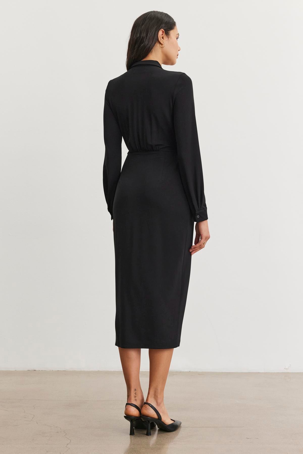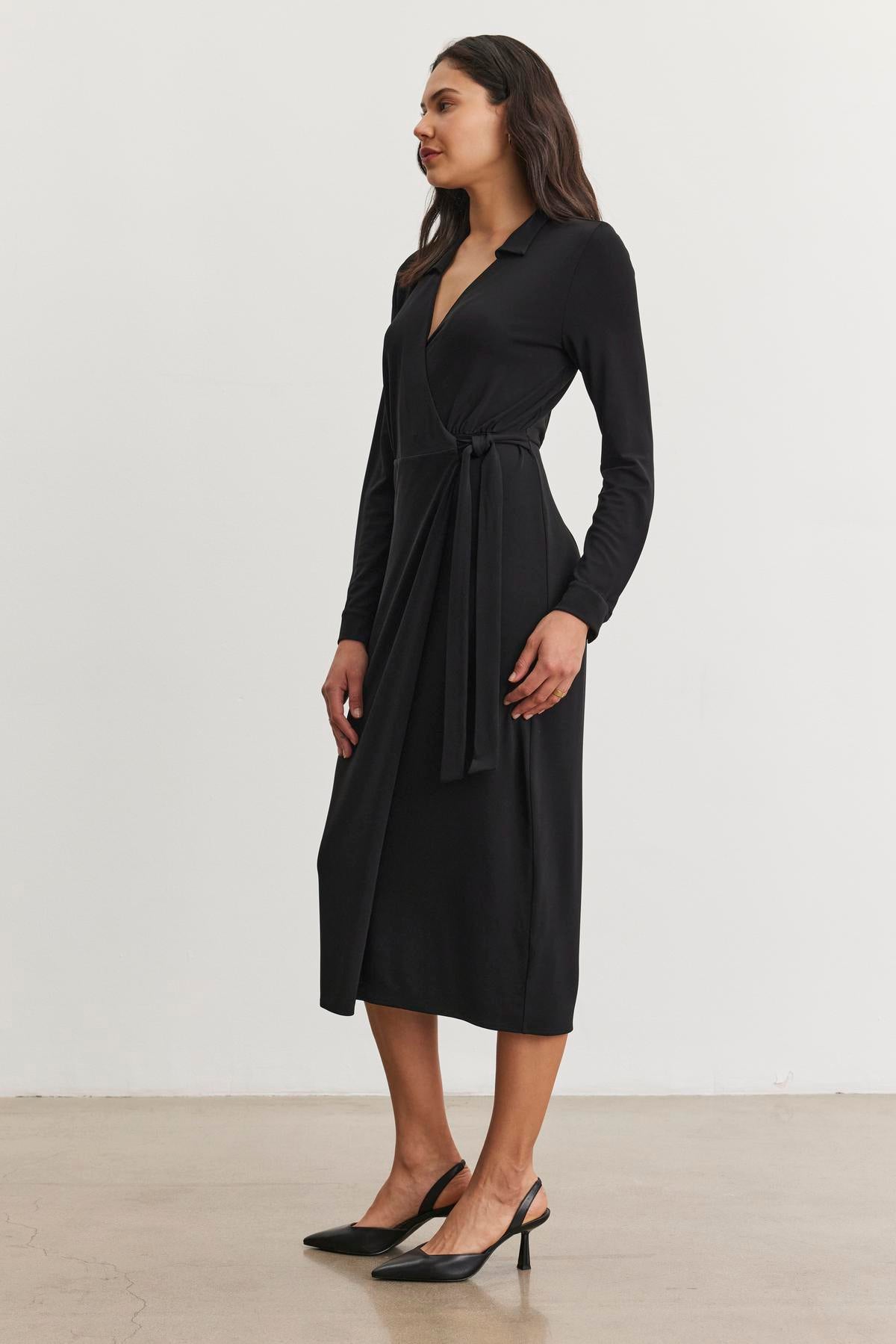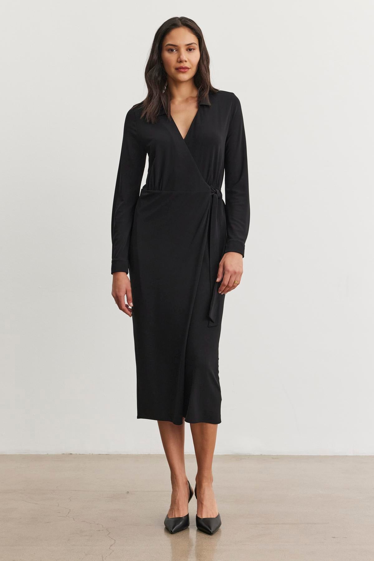A figure-flattering wrap style dress made with a matte viscose jersey fabric that includes a hint of stretch for comfort. Its midi length and long sleeves make it a versatile option for any occasion.