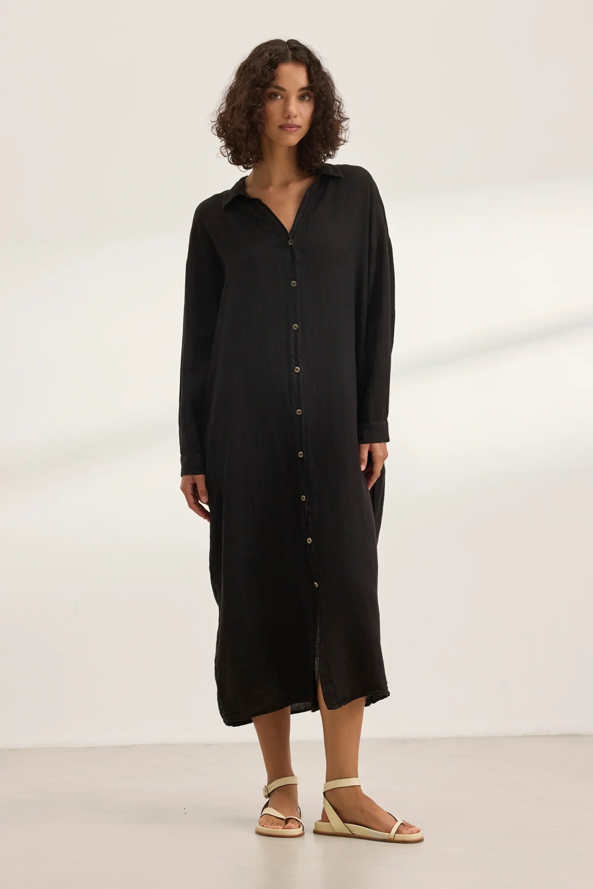 Crafted from lightweight woven linen, this button-up shirt dress offers breathable comfort and effortless versatility. Designed to be worn on its own or layered over the Stephanie Pant, it features side seam patch pockets and a detachable belt.