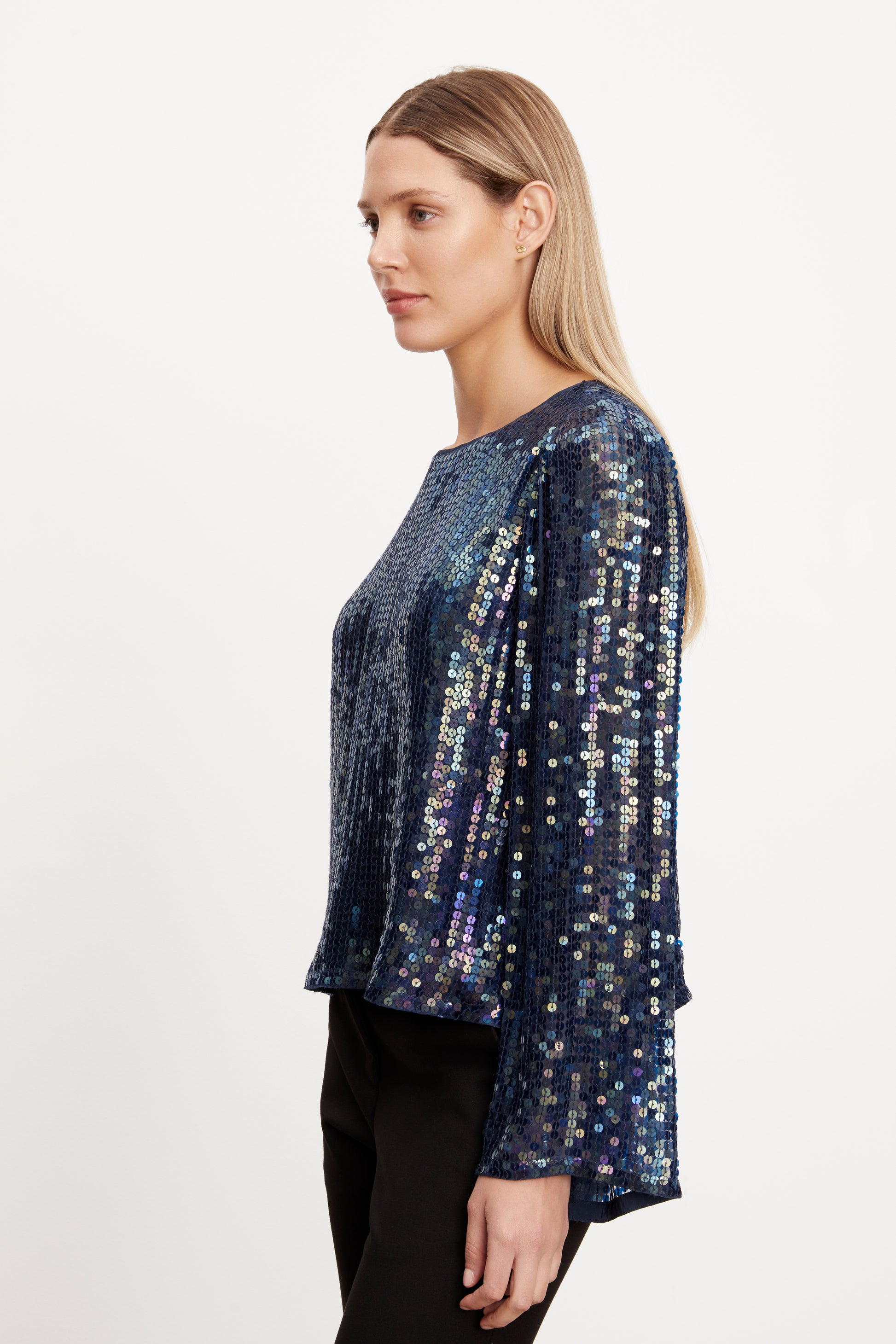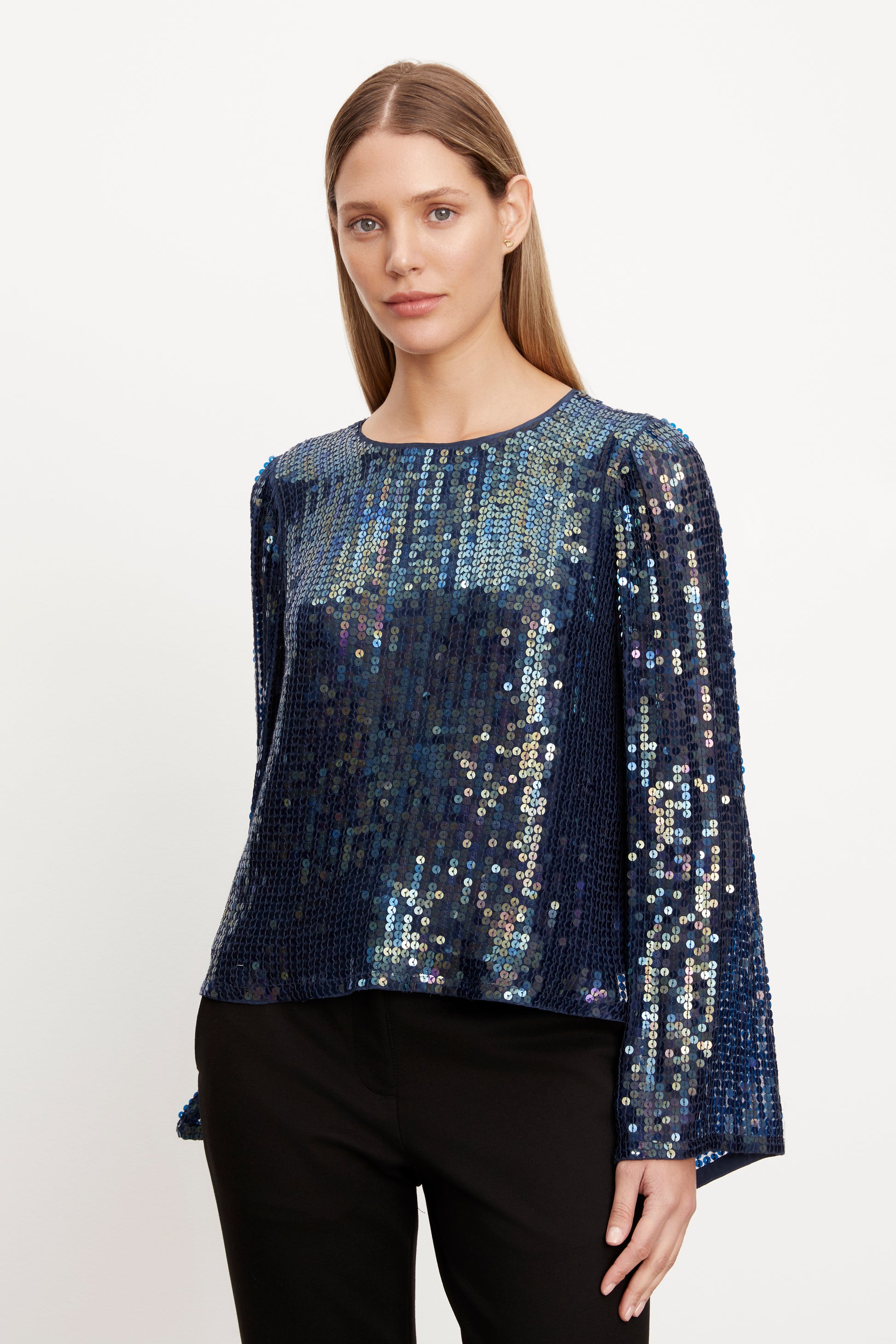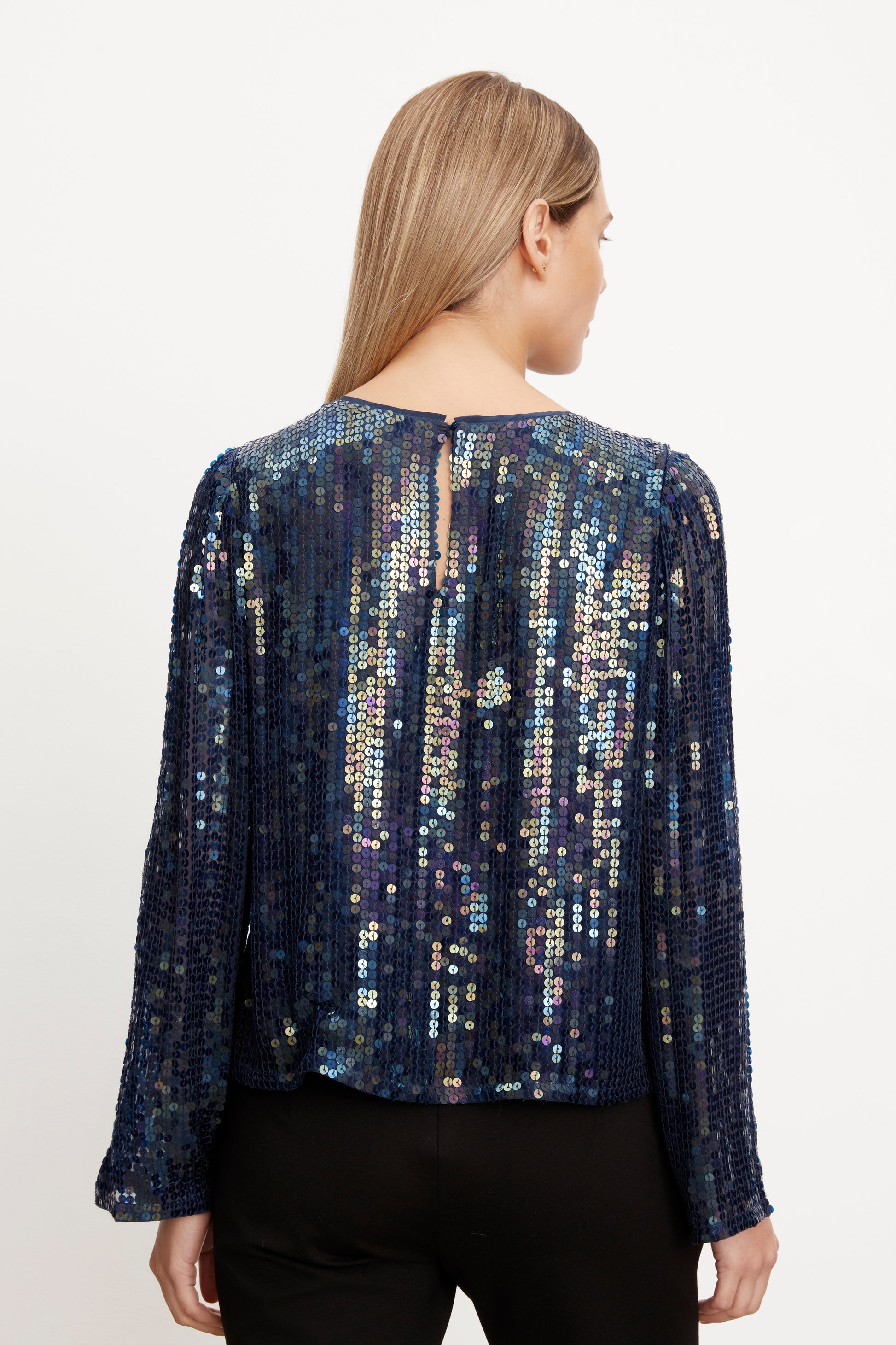 Make a sparkling statement with our women's top. Adorned with all-over sequins, this lined top boasts a slight bell sleeve, a crew neckline, and a single-button rear closure at the neckline. It's a glamorous addition to your wardrobe with a nod to retro style.