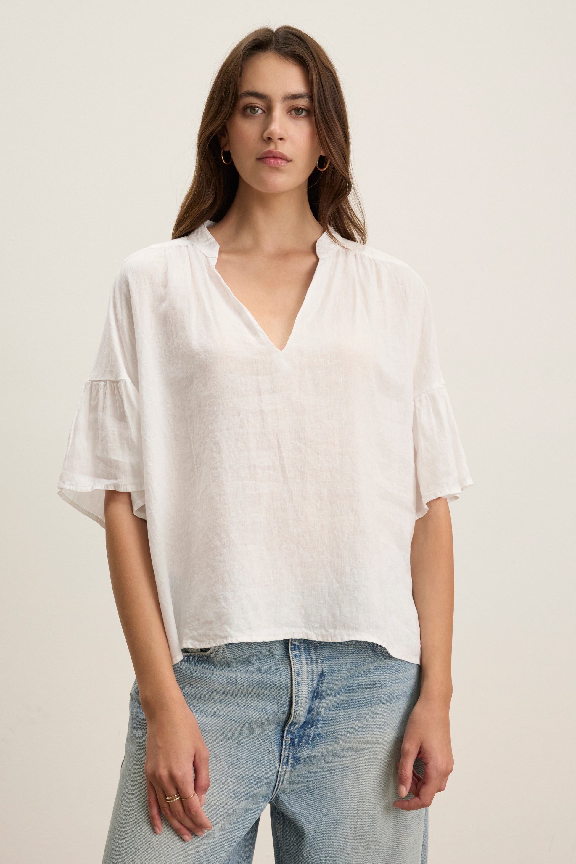 The Raye Top offers a relaxed, oversized fit with a flattering V-neckline and banded collar for a chic yet comfortable look. Crafted from lightweight woven linen, it features ruffle sleeves and a shirred detail at the back, adding texture and dimension to this easygoing style.