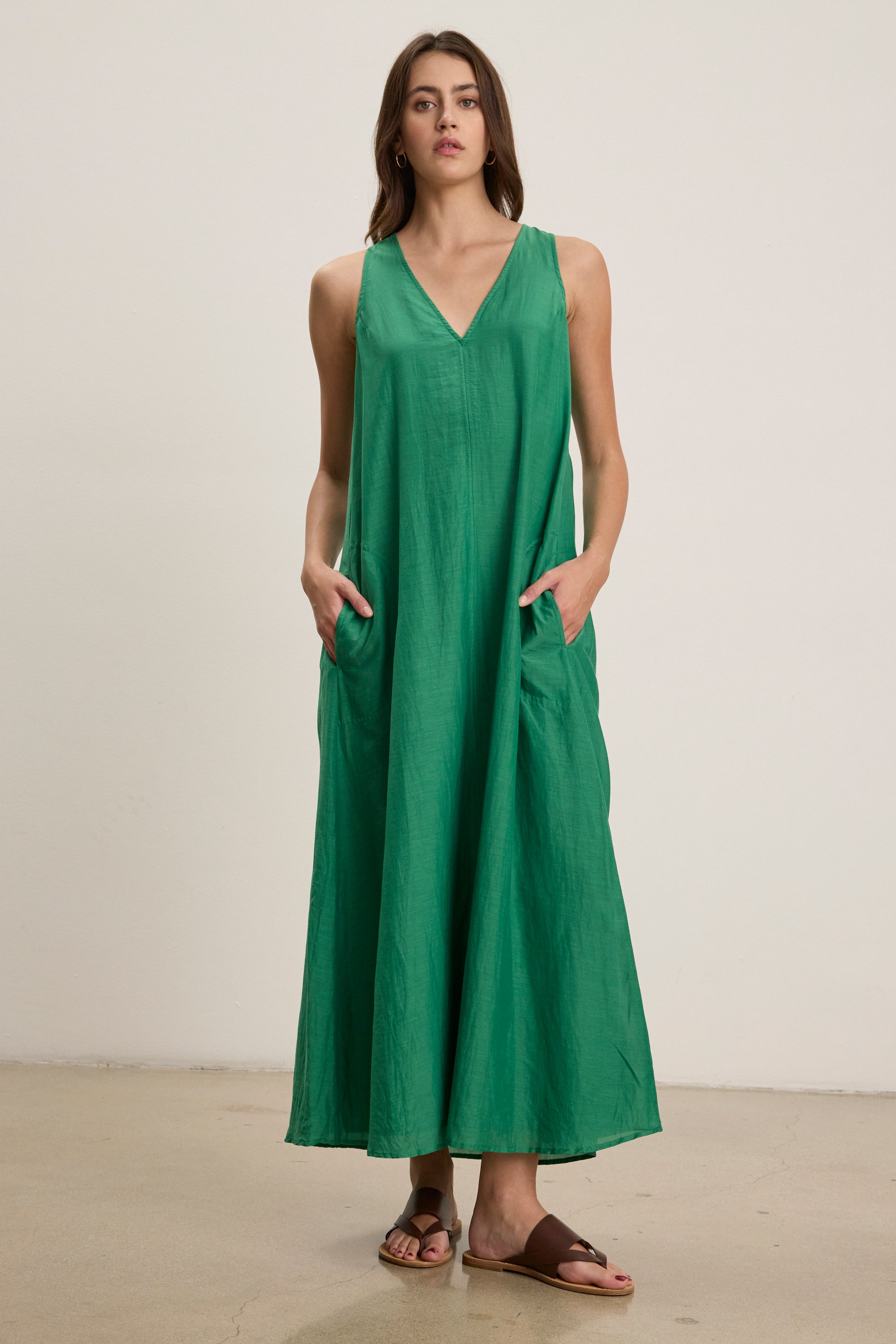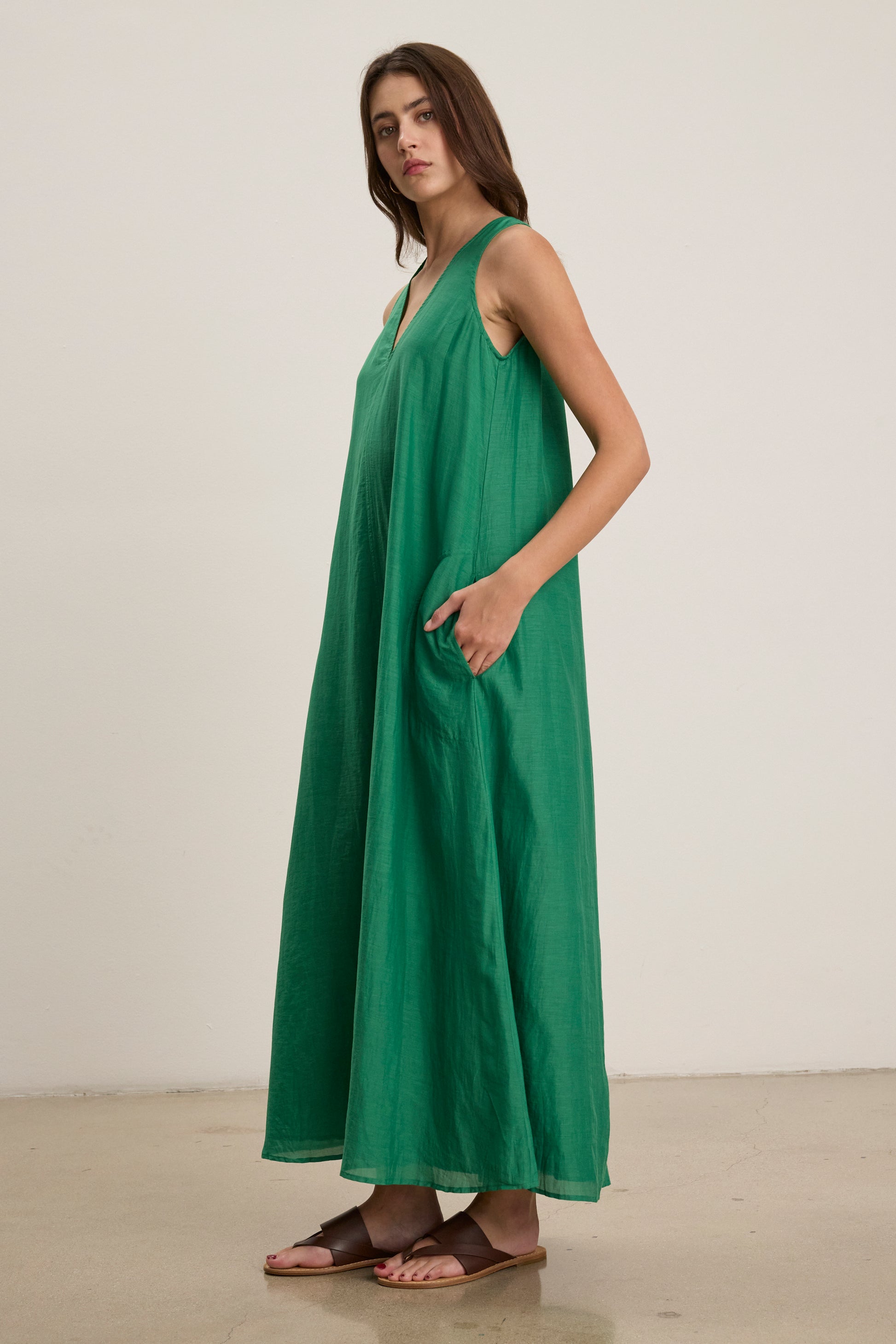 Crafted from airy silk cotton voile, this maxi dress features a flattering V-neckline, tank silhouette, and side seam patch pockets for added ease. A detachable belt allows you to adjust the shape to suit your style, making it a versatile staple for warm-weather dressing.