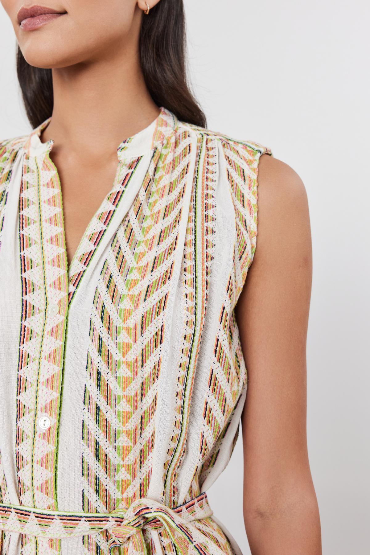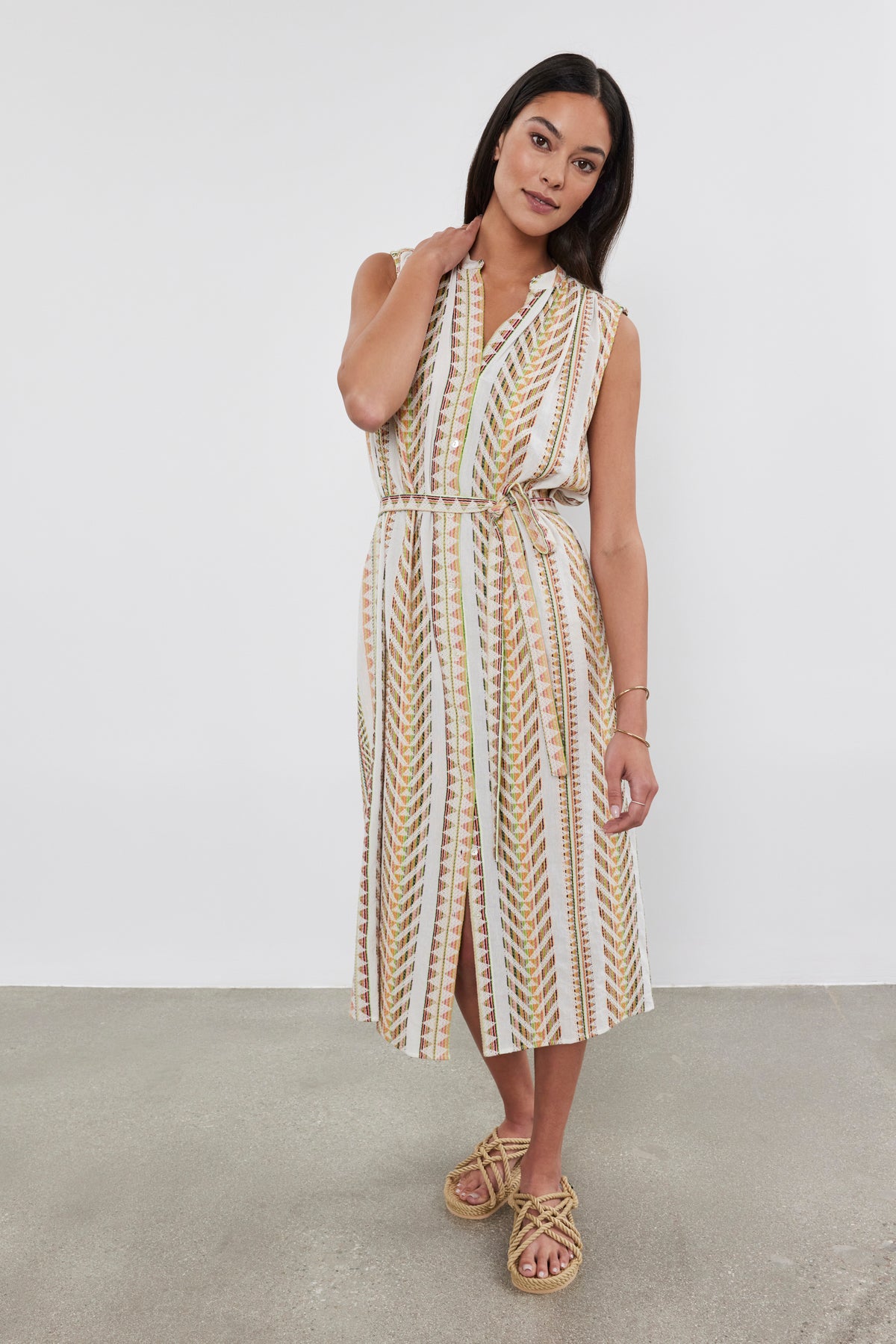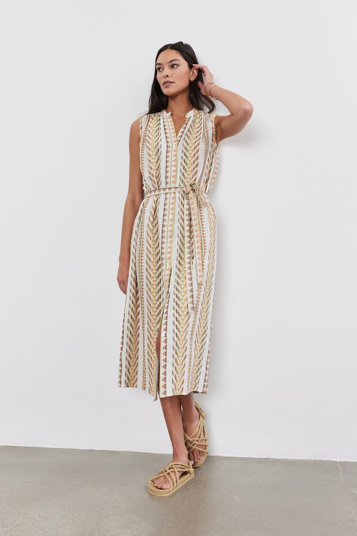Featuring chic jacquard striped fabric, this dress boasts a split neck and sleeveless design for a contemporary edge. The button front and detachable belt add functional flair, making it suitable for various occasions from weekend brunches to beach vacations. This midi-length dress is a must-have addition to your wardrobe.