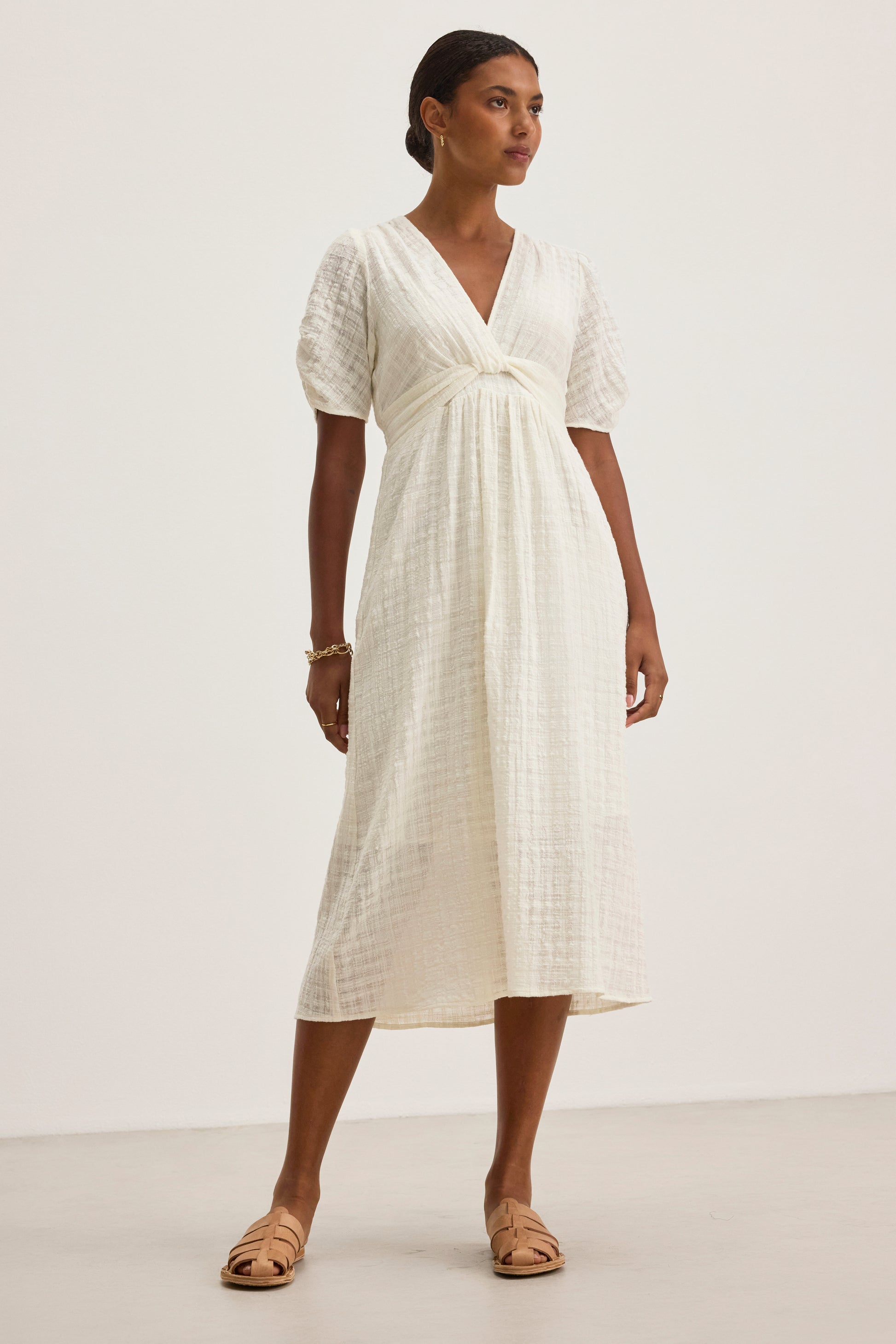 Crafted from textured cotton gauze, this midi dress features a v-neckline and a flattering front knot detail at the waist, complemented by an elastic back for added comfort. Ruched puff sleeves and a detachable slip complete the design, combining elegance and ease.