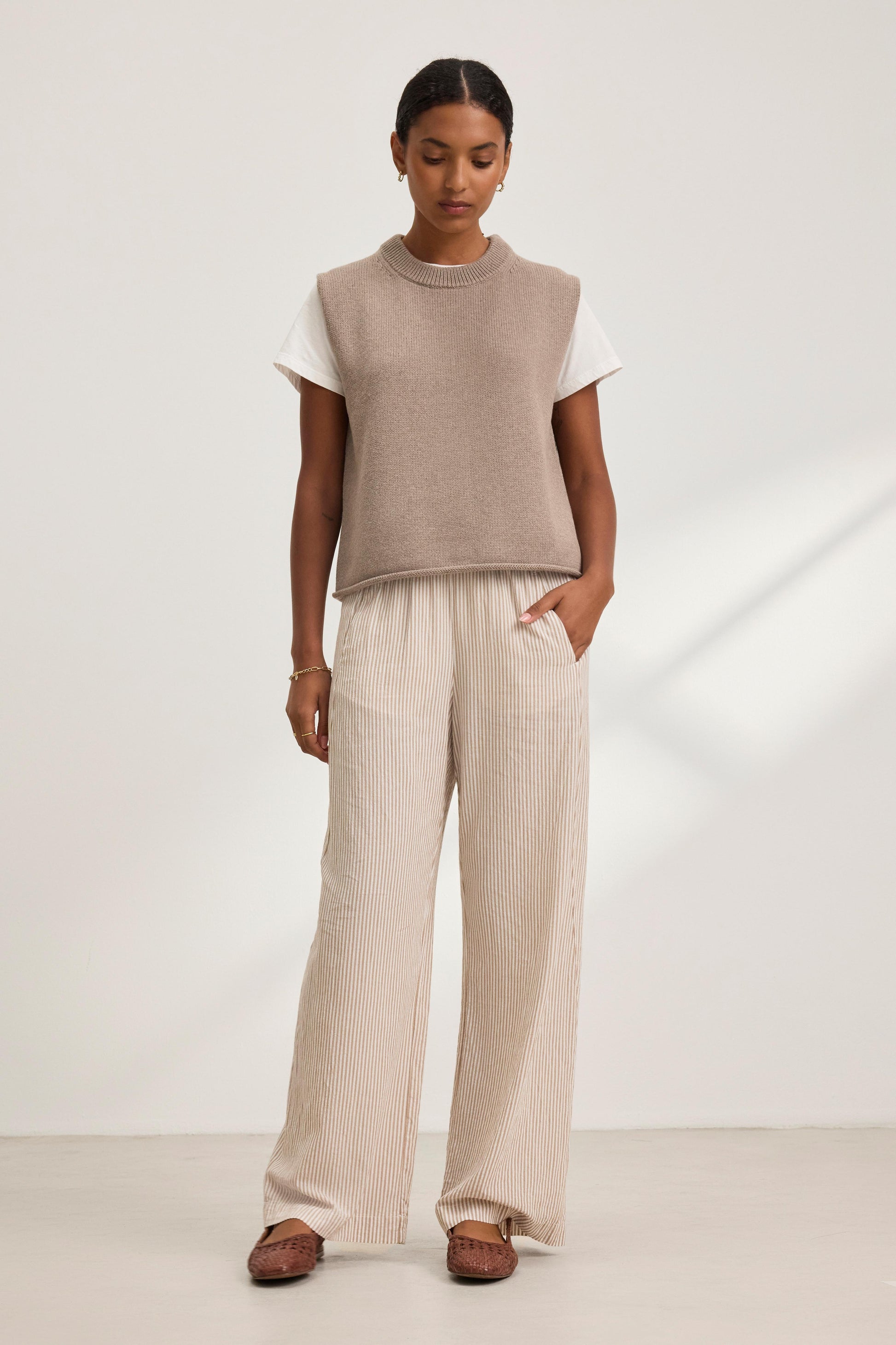 Crafted from a lightweight cotton blend, these striped pants offer a relaxed, wide-leg silhouette with an elastic waist for an easy fit. Slash pockets complete the look, making them a versatile option for casual or elevated styling.
