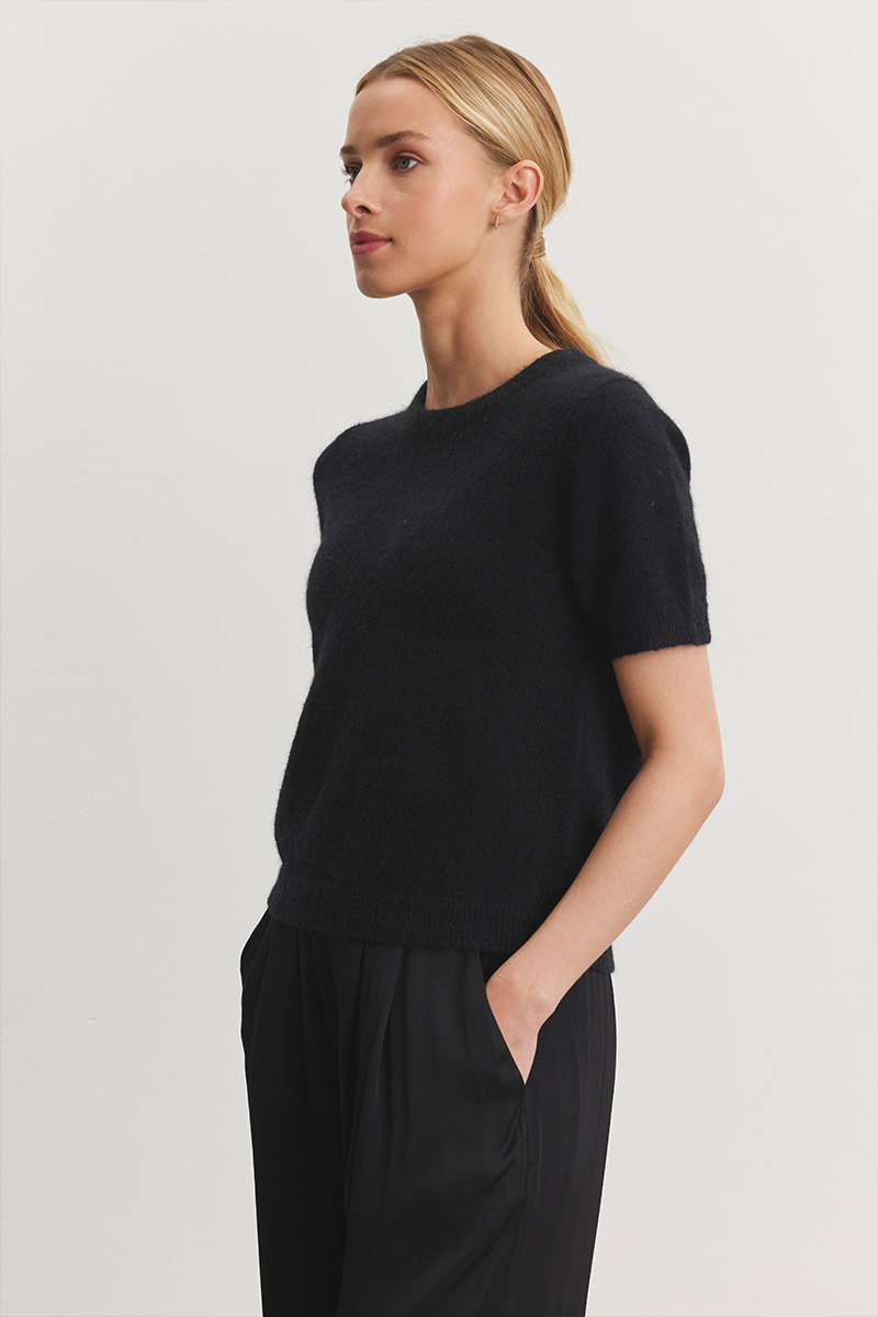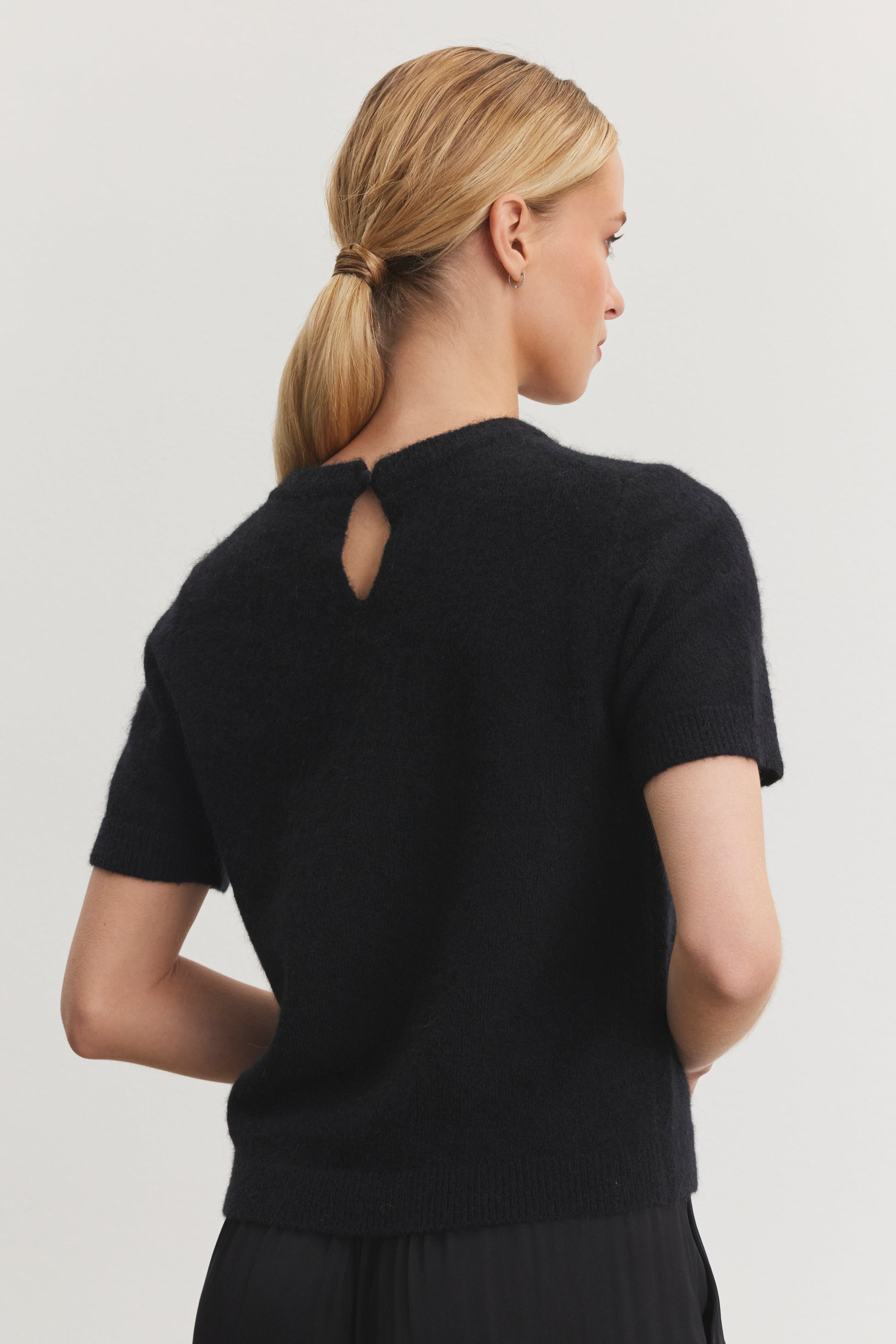 Crafted from a soft alpaca blend, this sweater features a classic crew neckline, short sleeves, ribbed trims, and a keyhole closure at the back for a timeless touch.