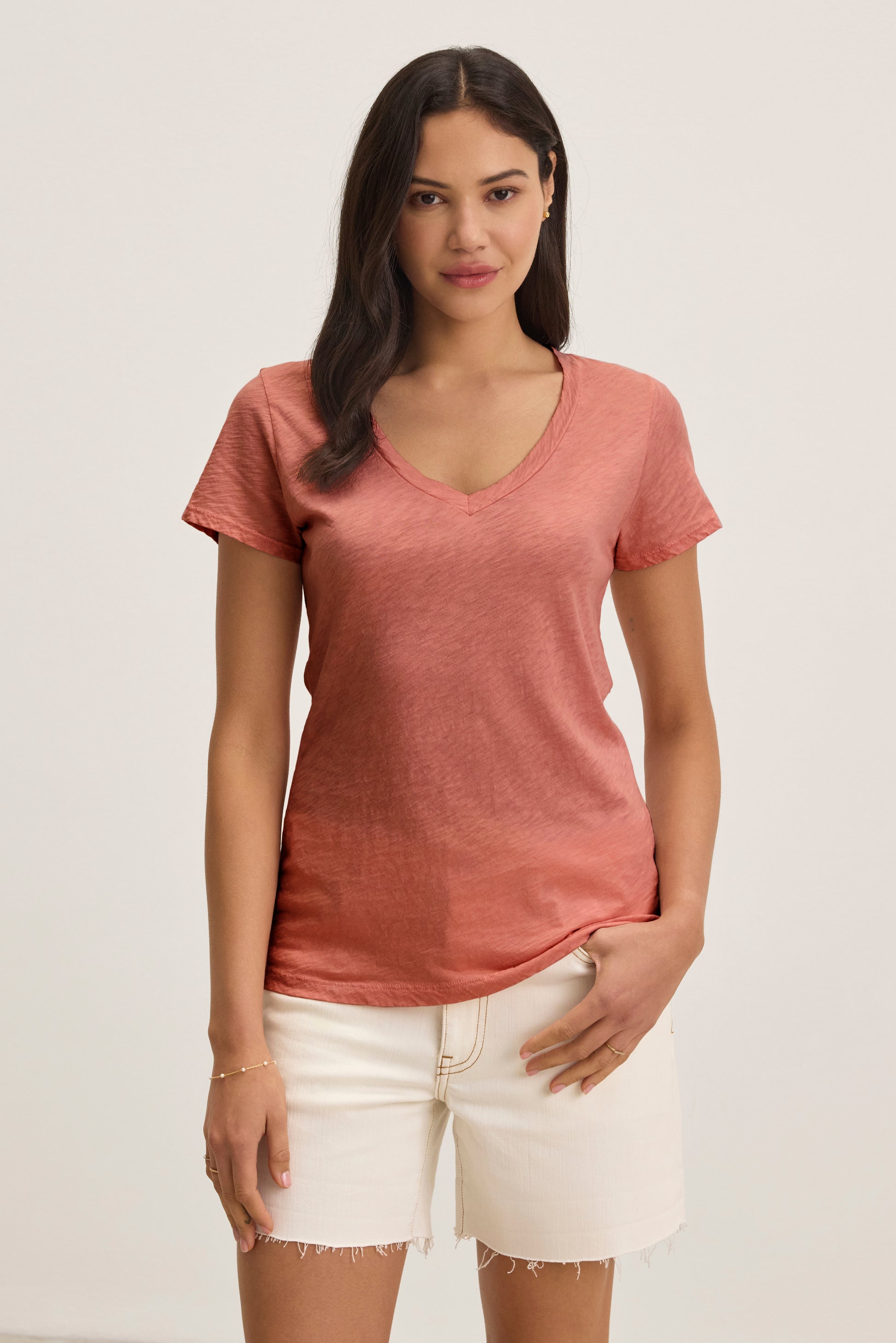 This is a great v-neck tee. A little bit preppy with a pinch of tomboy style, it's the perfect basic. Cut from our luxe cotton slub, it's super soft, washes beautifully and hugs your body in all the right spots.