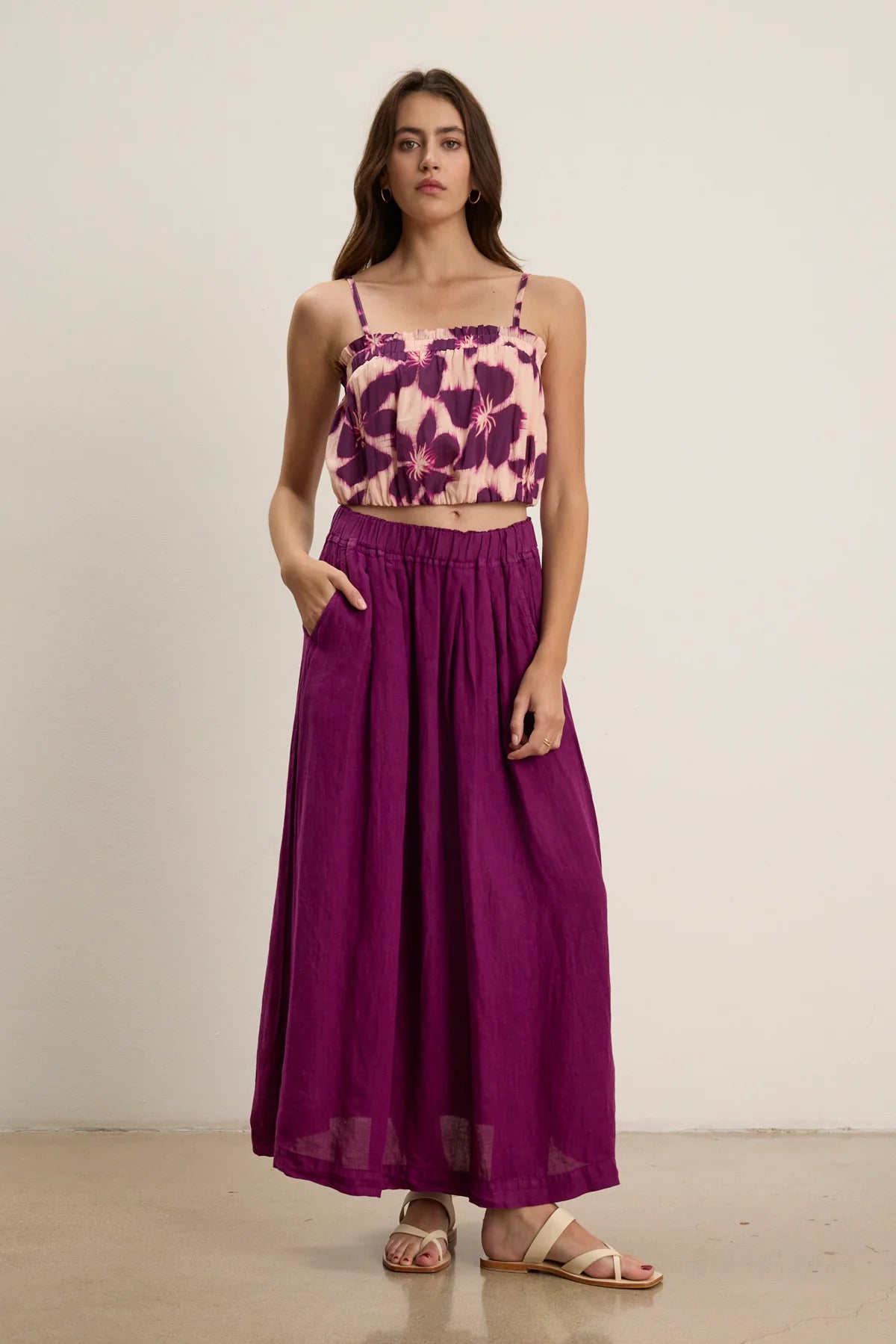 Crafted from breathable woven linen, this maxi skirt offers a timeless A-line silhouette with a relaxed, pull-on fit. An elastic waistband and slash pockets add comfort and functionality, making it a versatile wardrobe staple.