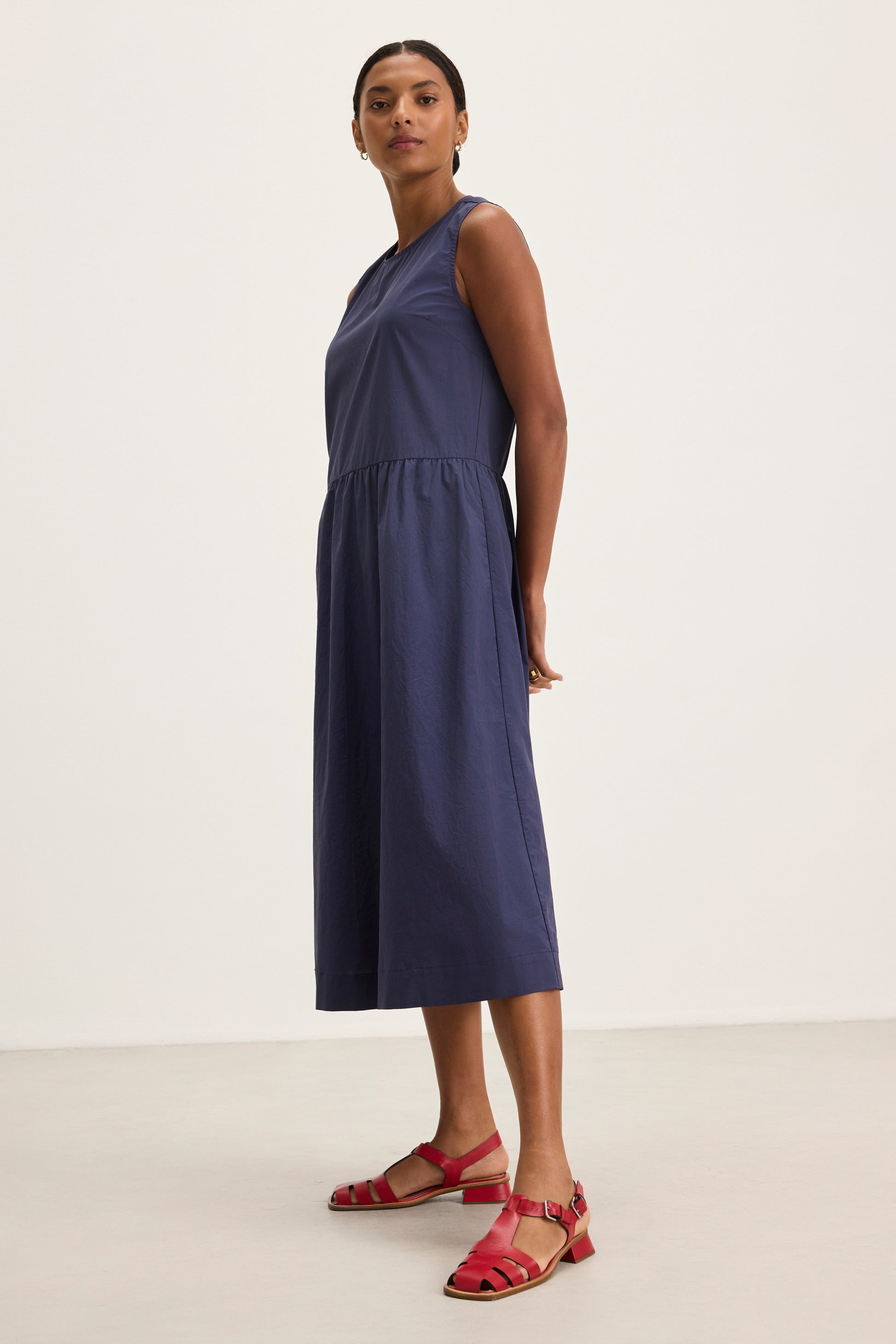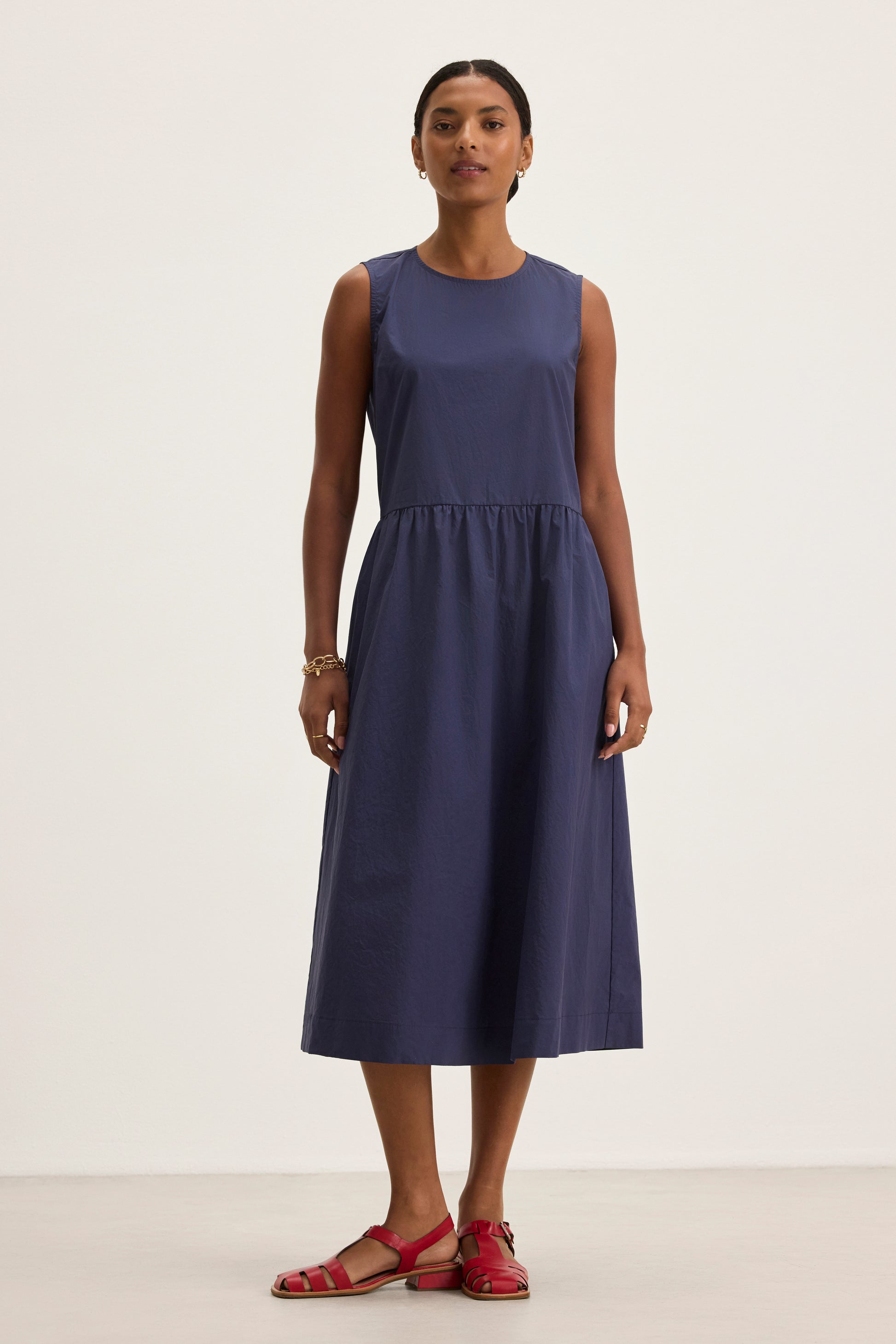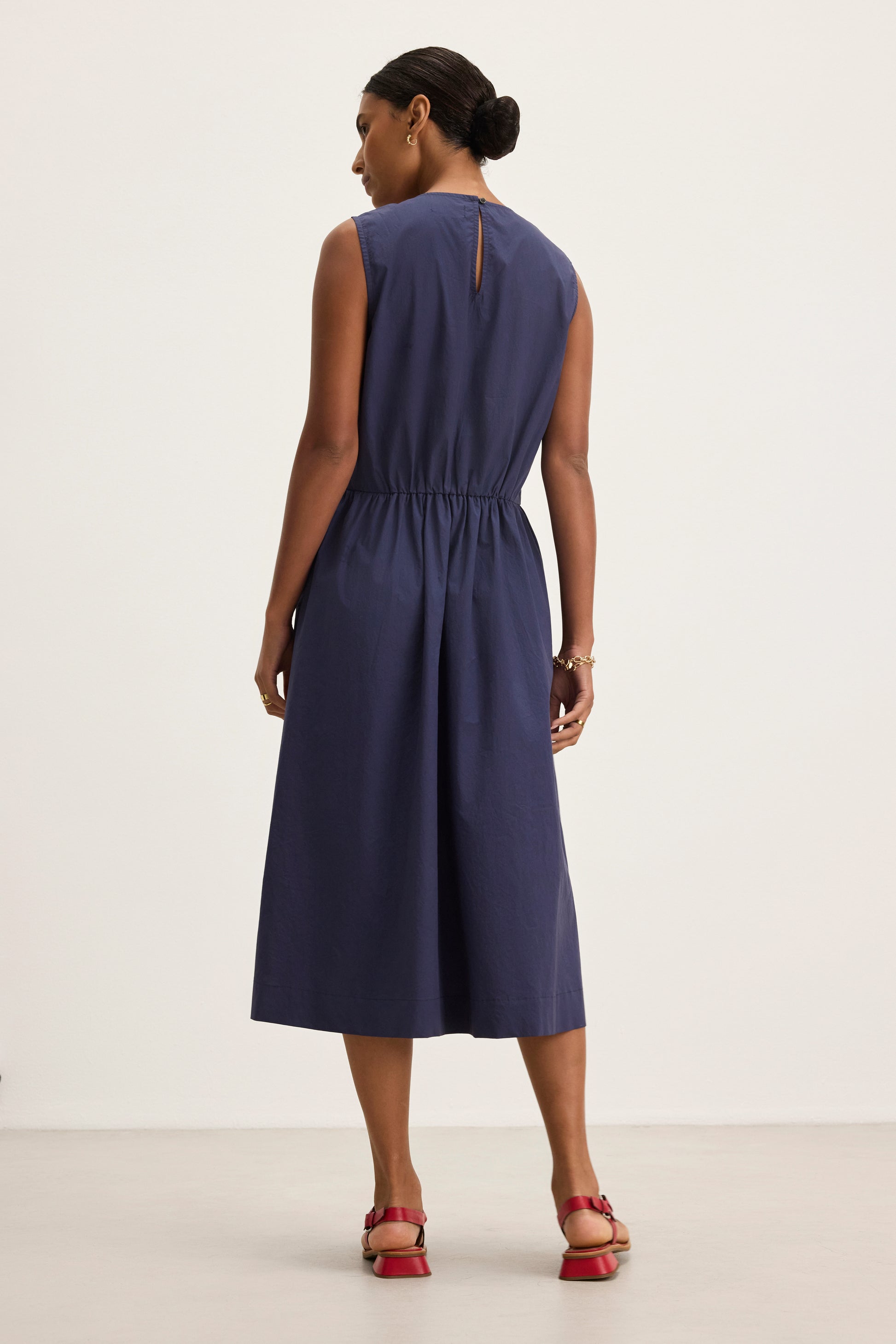 This midi-length dress is crafted from lightweight, structured cotton poplin for a clean, polished look. Featuring a round neckline, sleeveless design, elastic waist, and side seam pockets, it’s a timeless, easy-to-wear piece.