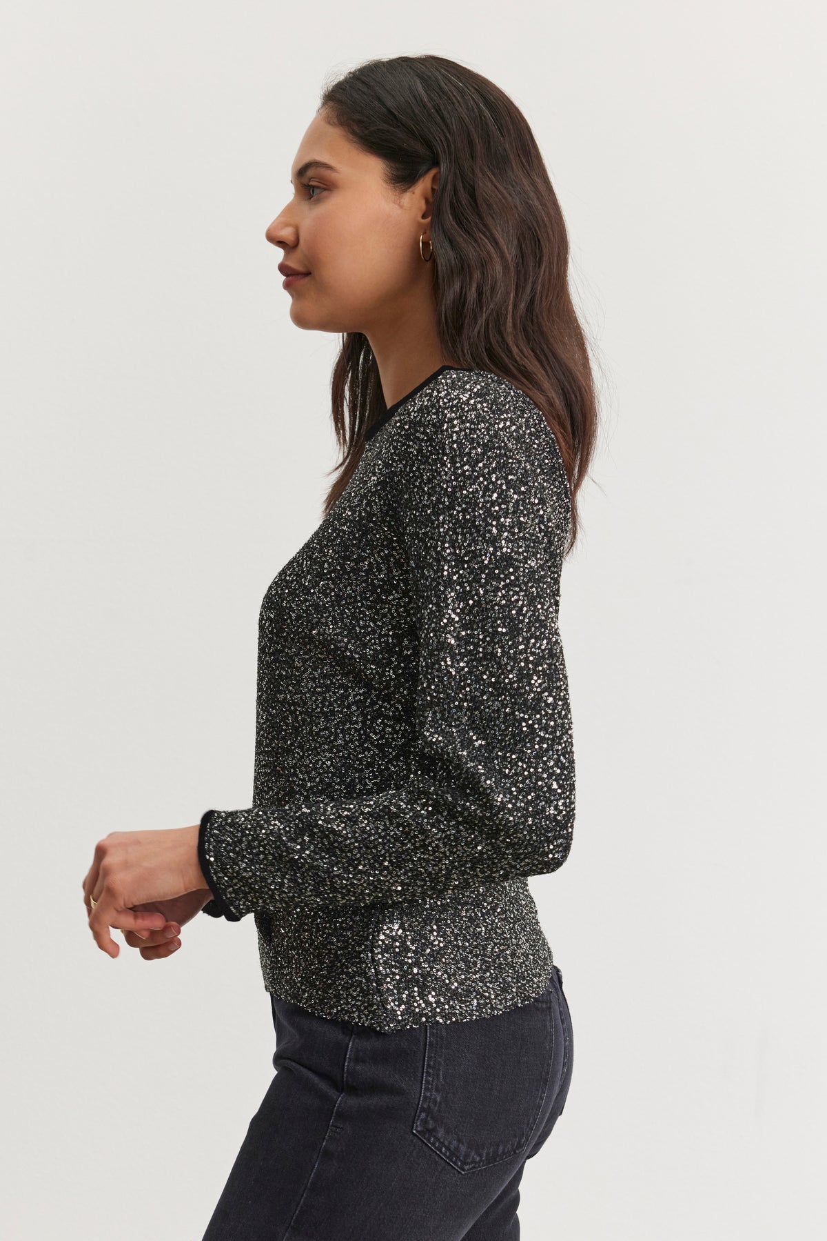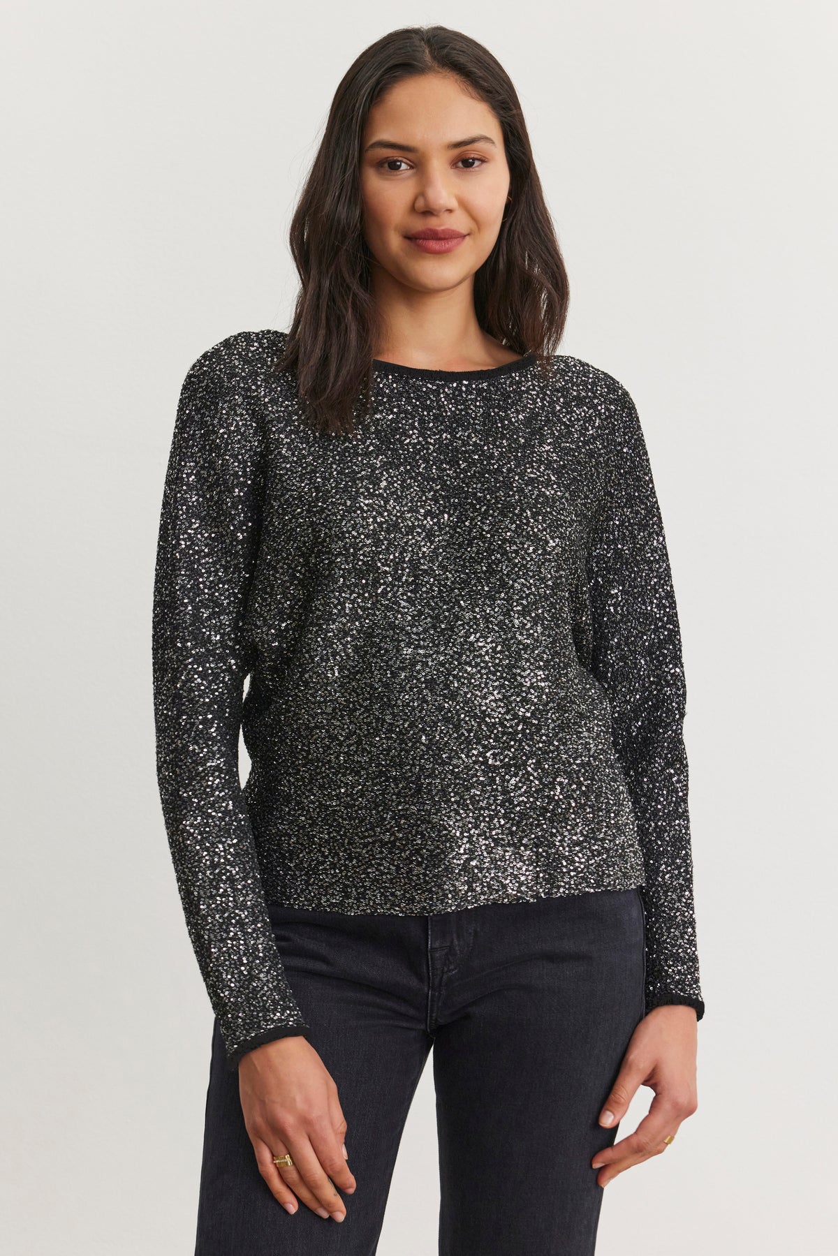 Expertly crafted from a luxurious cotton blend with a hint of stretch, this sweater is a must-have for the holiday season. Featuring an intricate sequin knit that adds shimmer and texture, it boasts a classic crew neck in the front and a deep v-neck at the back.