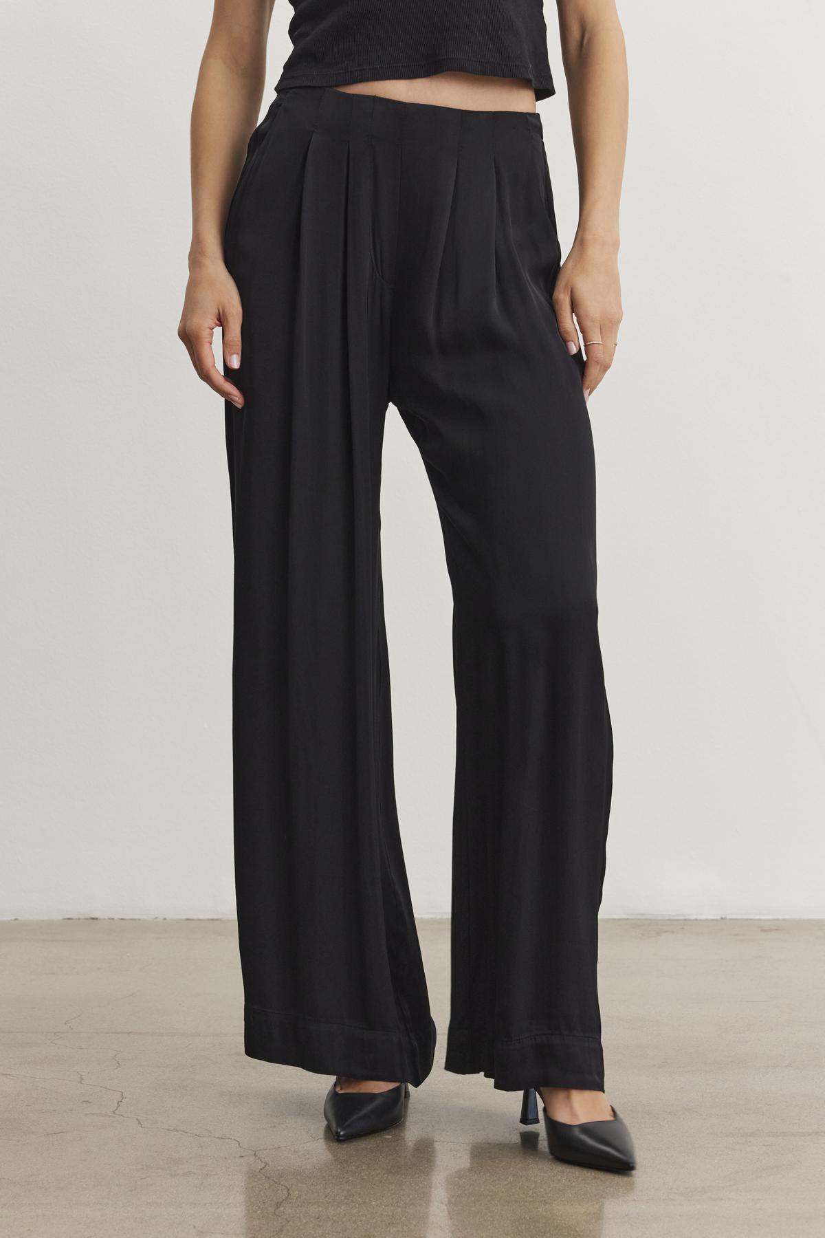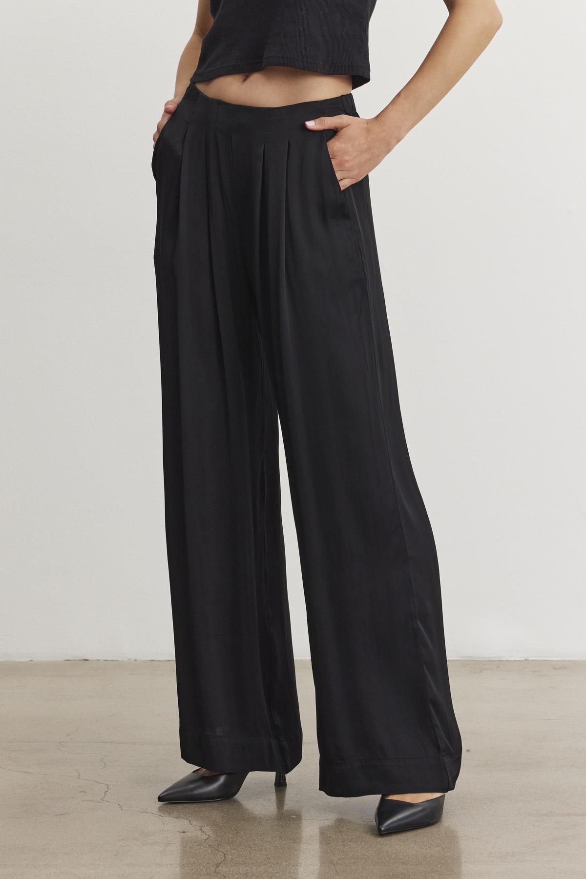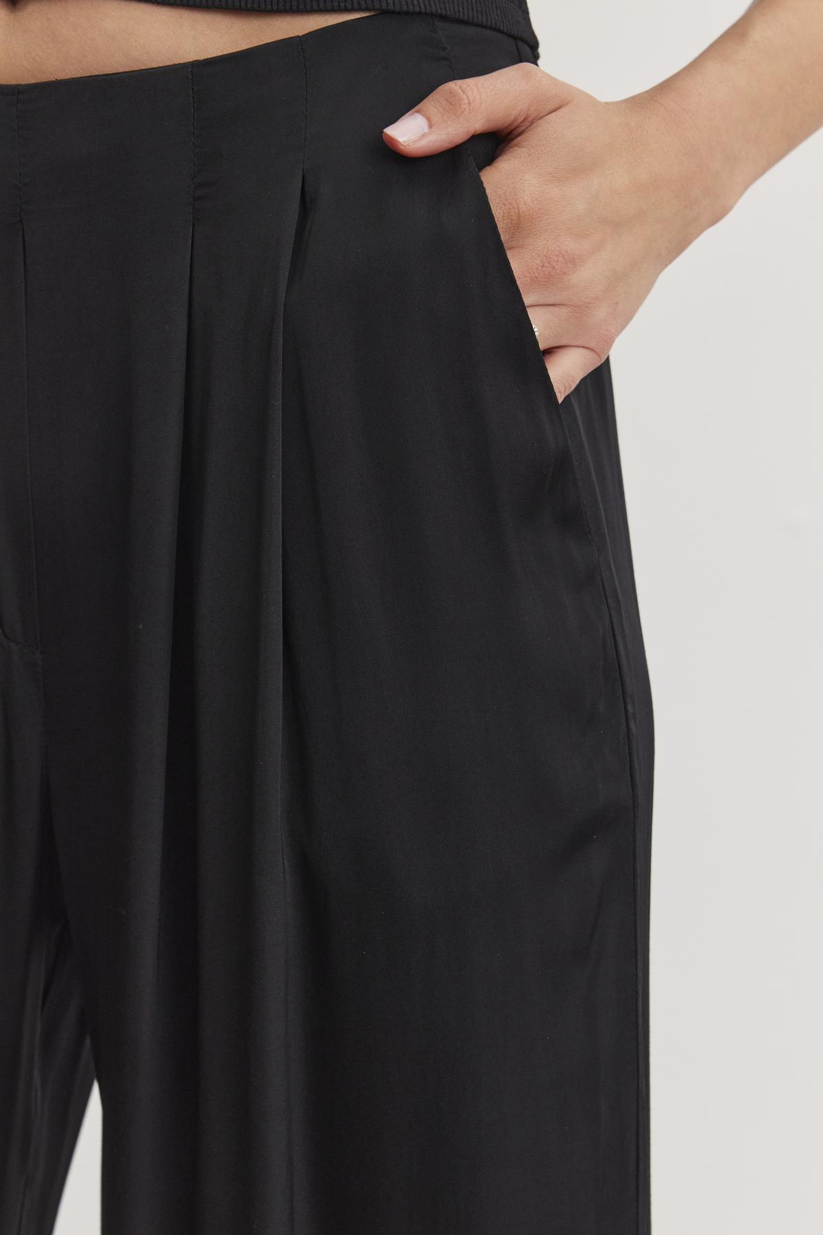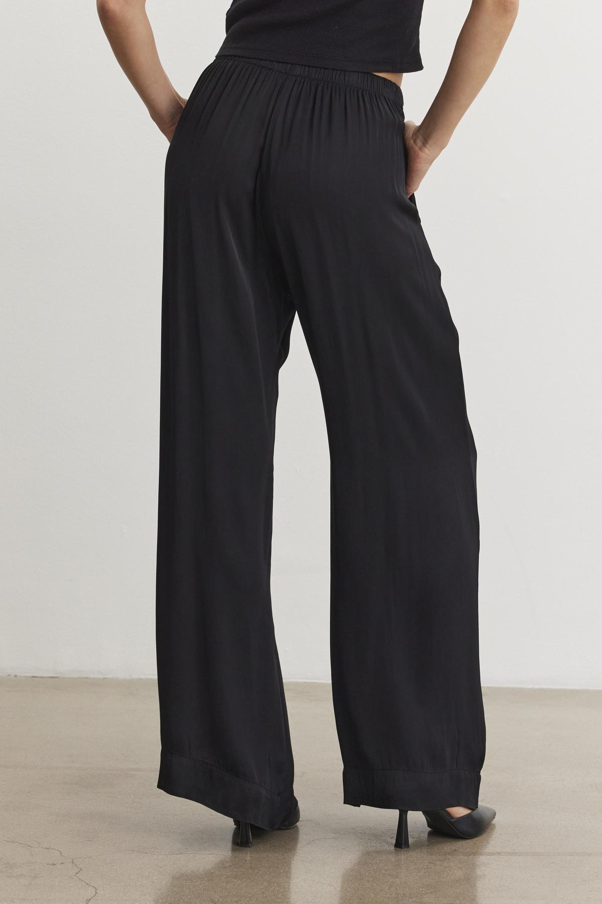 Made from satin viscose with a subtle sheen, these wide-leg pants feature a rear elastic waistband, front pleats, and slash pockets, combining comfort with an elegant drape.