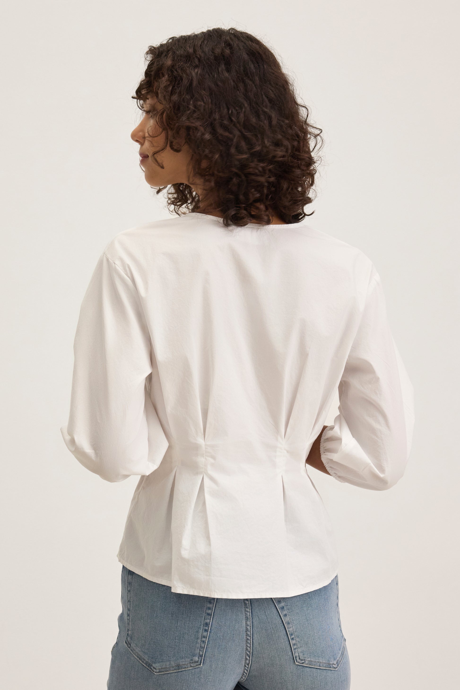 Made from lightweight cotton poplin, this top features two front ties for closure, offering versatility to wear on its own or as a layer. Finished with 3/4 sleeves and elastic cuffs for an easy, relaxed fit.