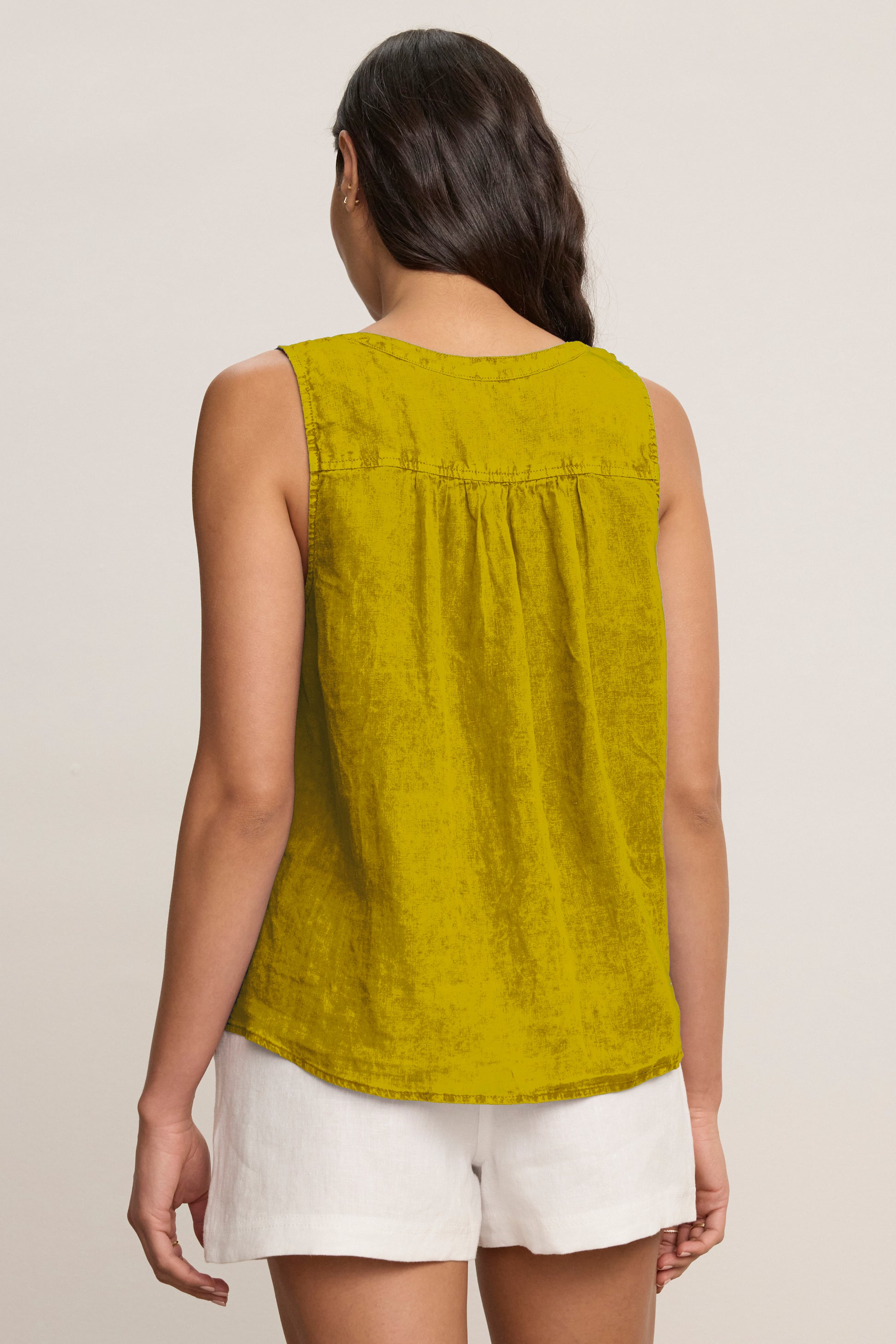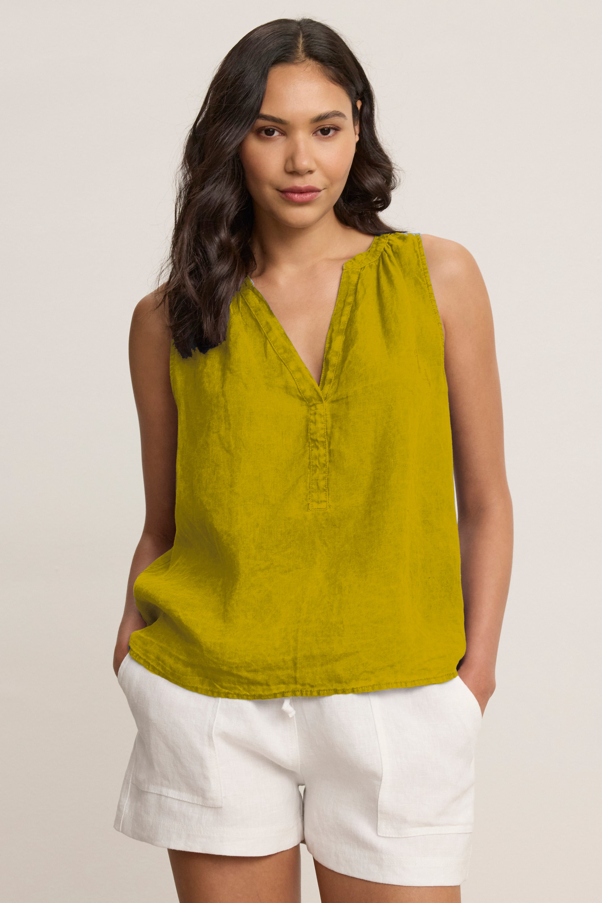 This woven linen sleeveless top features a flattering v-neckline and a relaxed fit, ideal for warm days and relaxed evenings. Complete with a high-low scooped hemline and shirred details on the rear, it's a versatile piece that effortlessly pairs with your favorite shorts or jeans for an easy-going look.
