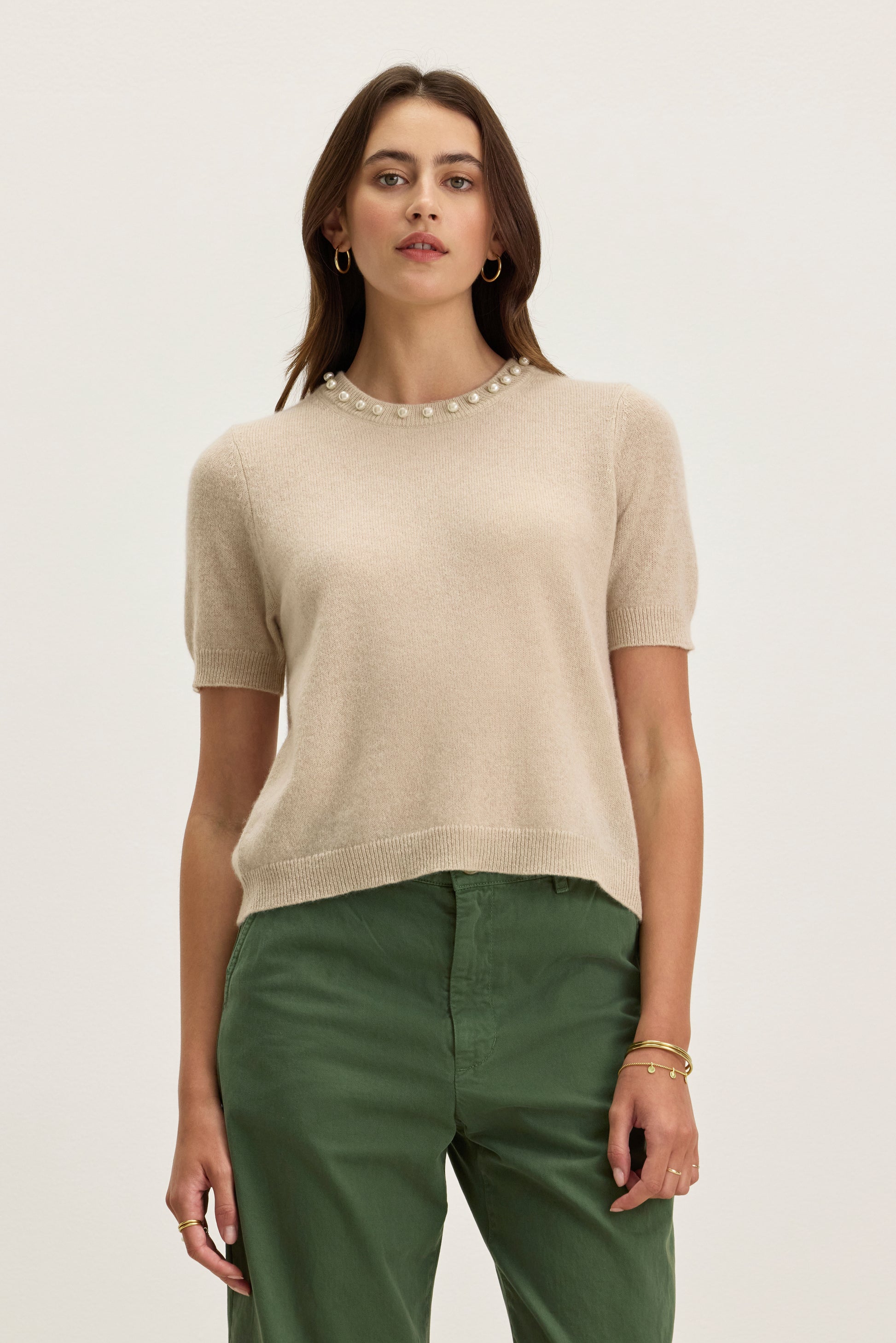 Crafted from soft cashmere, this sweater offers a luxurious feel. It features a classic crew neckline with faux-pearl embellished trim, ribbed finishes, and short sleeves for a refined, relaxed silhouette. Perfect for layering or wearing solo, it’s a timeless wardrobe addition.