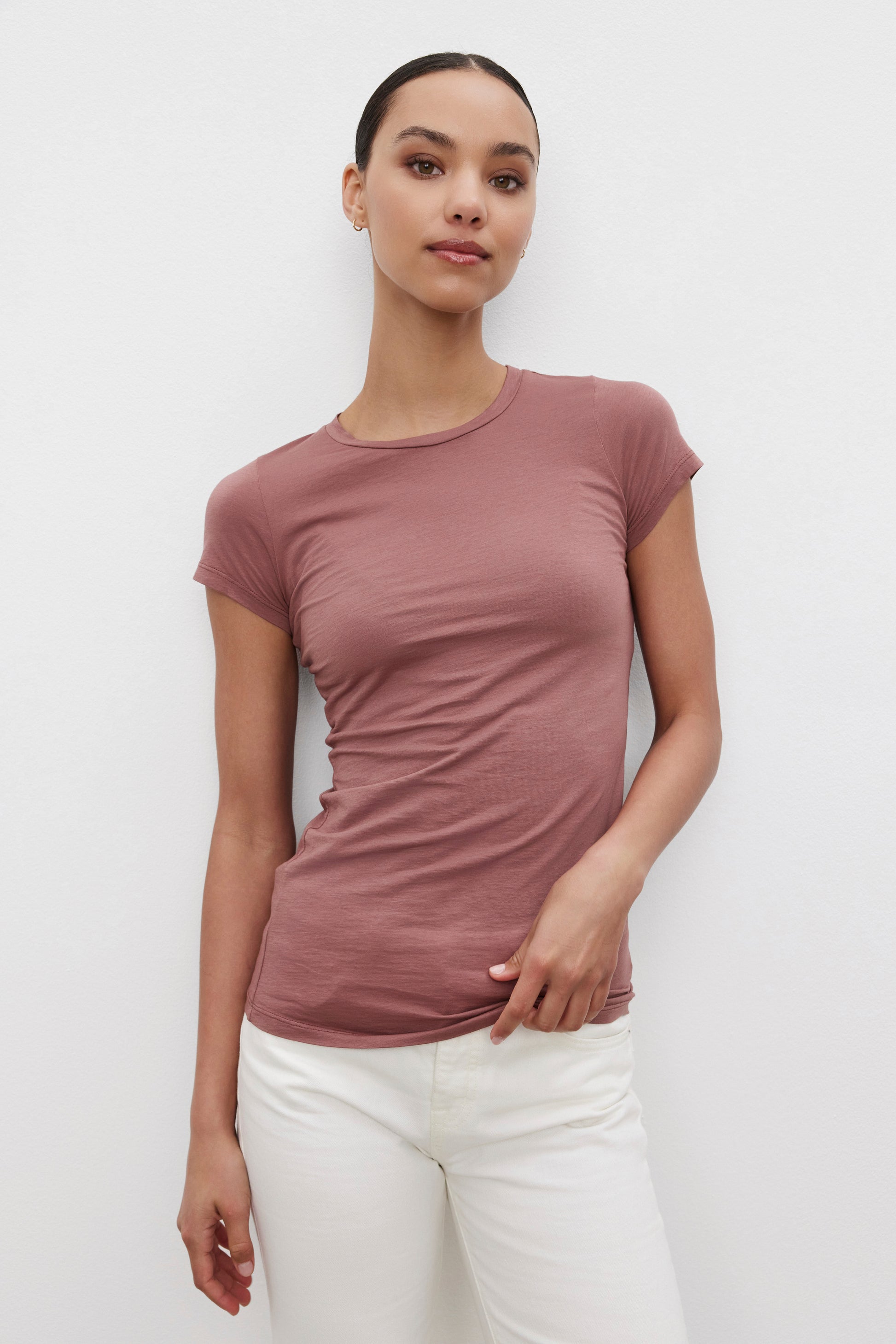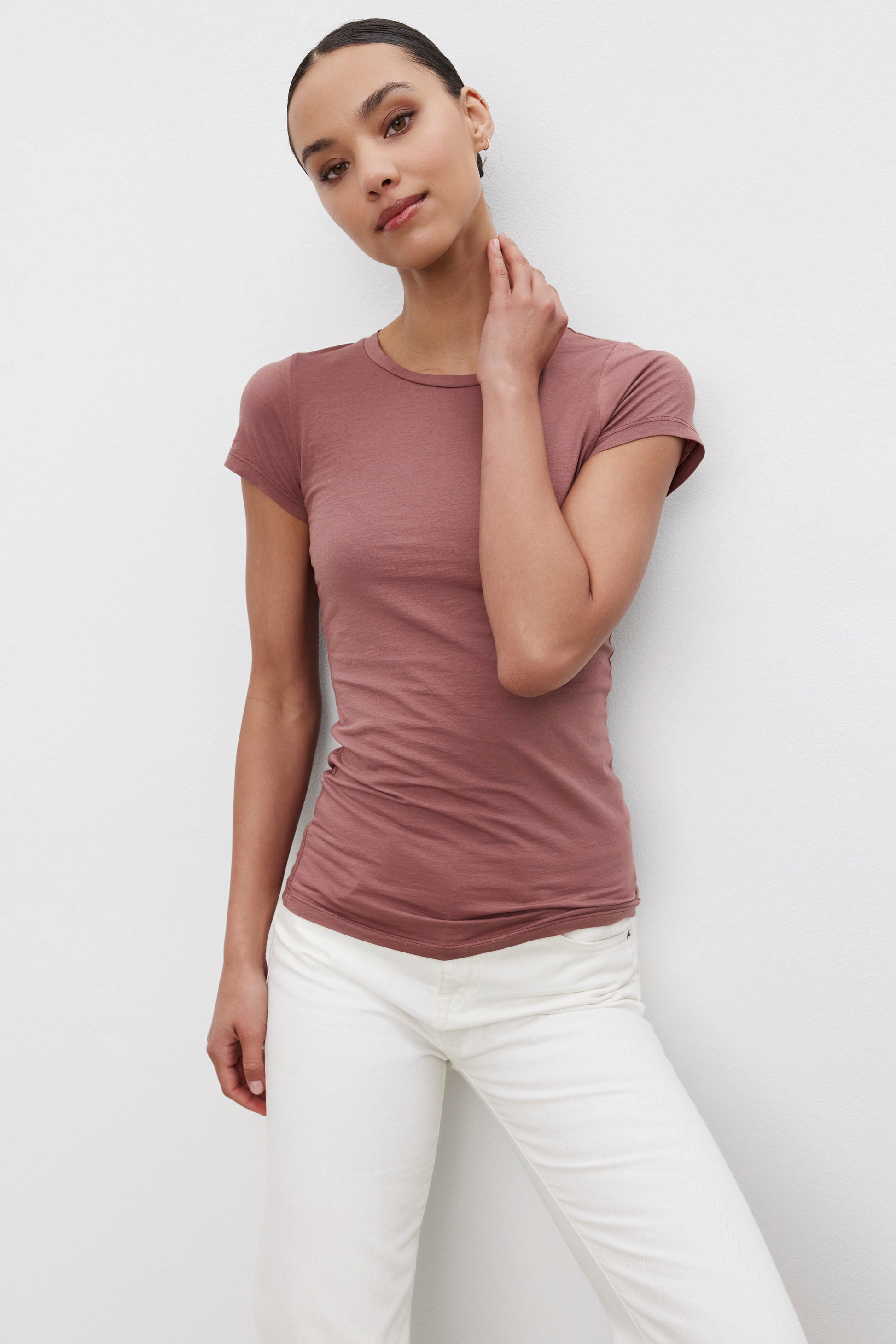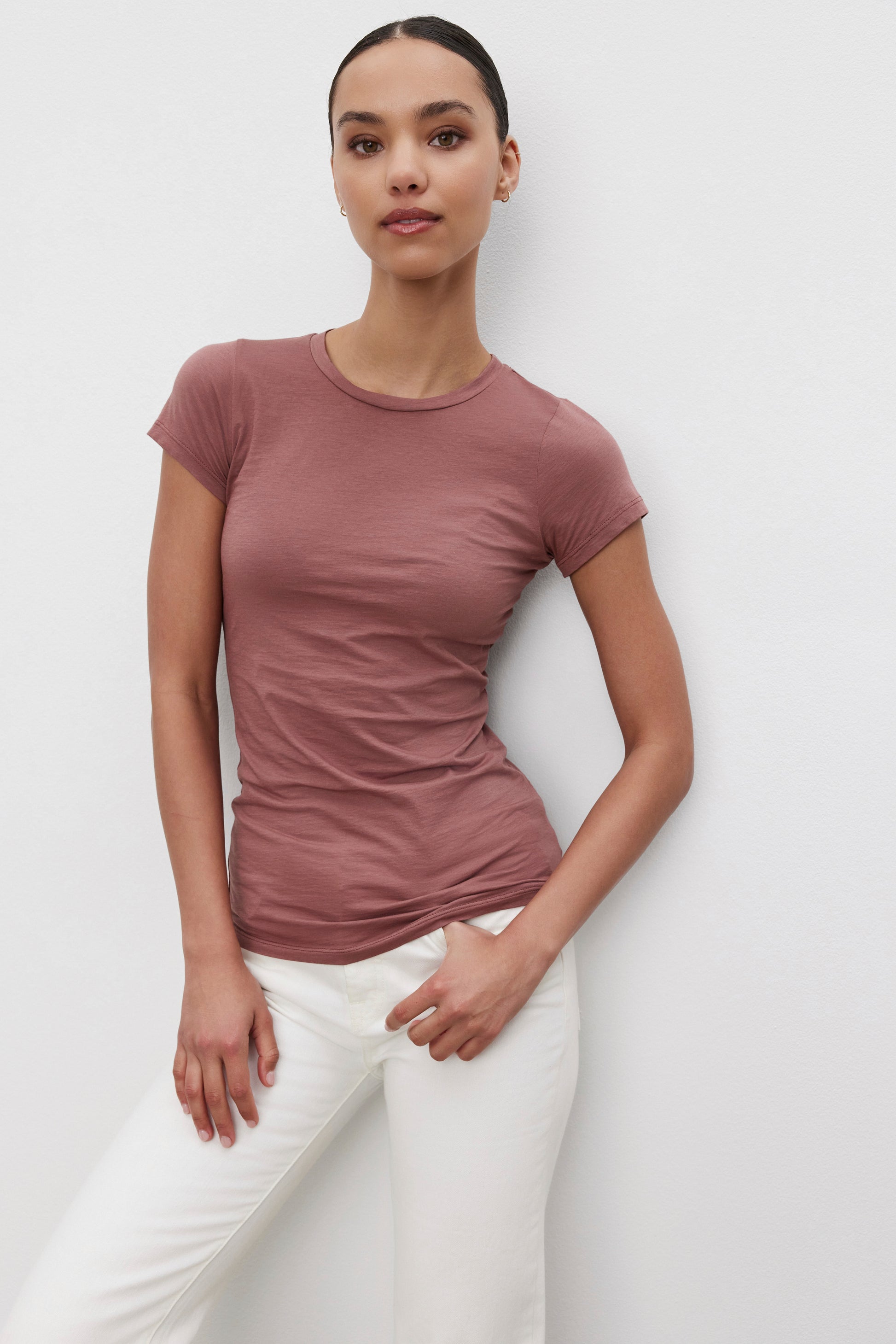 This crew neck tee is made from our ultra-soft gauzy whisper fabrication, making it the perfect addition to any wardrobe. With its iconic design, this fitted tee is sure to be a timeless staple that can be worn for years to come.