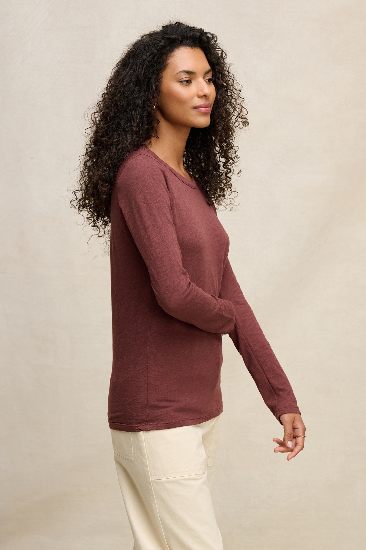 Crafted from textured cotton slub, this tee features long sleeves and a classic crew neckline. Perfect for layering or wearing on its own, it is designed to offer exceptional softness and effortless wear throughout the year.