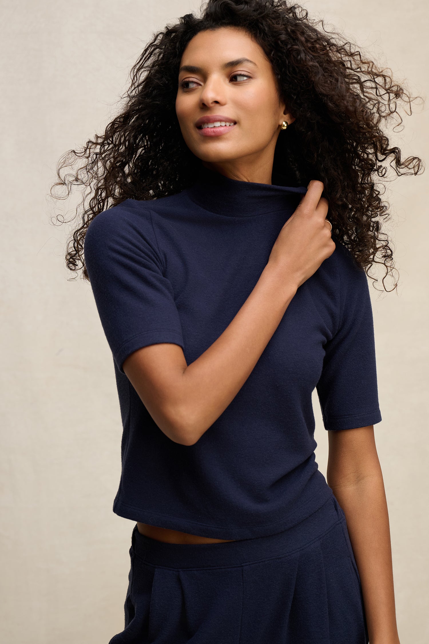 This top offers a modern, boxy fit with a cropped length and half sleeves, finished with a sleek mock neck. Crafted from a soft cotton-viscose blend, it delivers lightweight comfort. A versatile piece perfect for layering or wearing on its own.