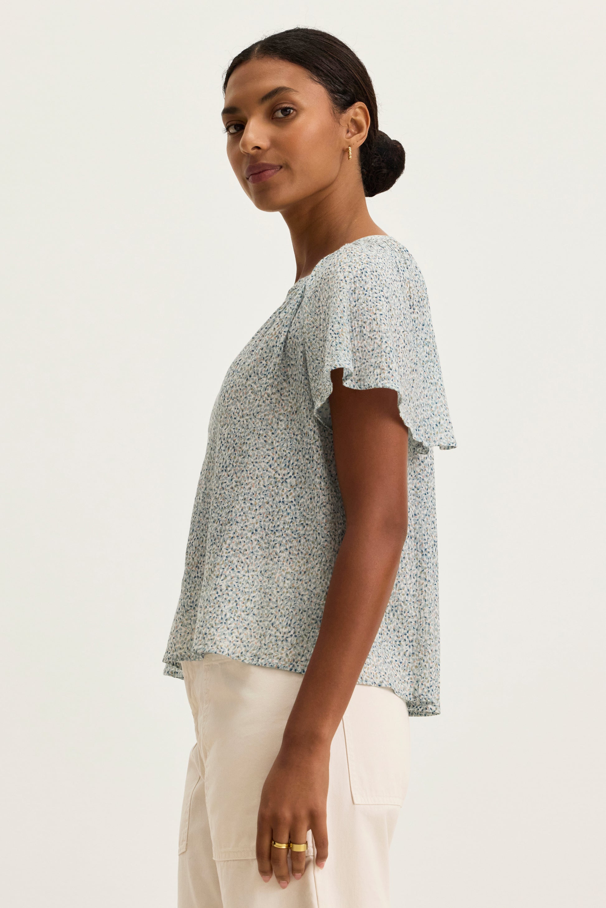 Crafted from crinkle cotton gauze, this printed top features a v-neckline and flutter raglan sleeves for a relaxed, airy feel. The textured fabric and easy fit make it a versatile piece for everyday wear.