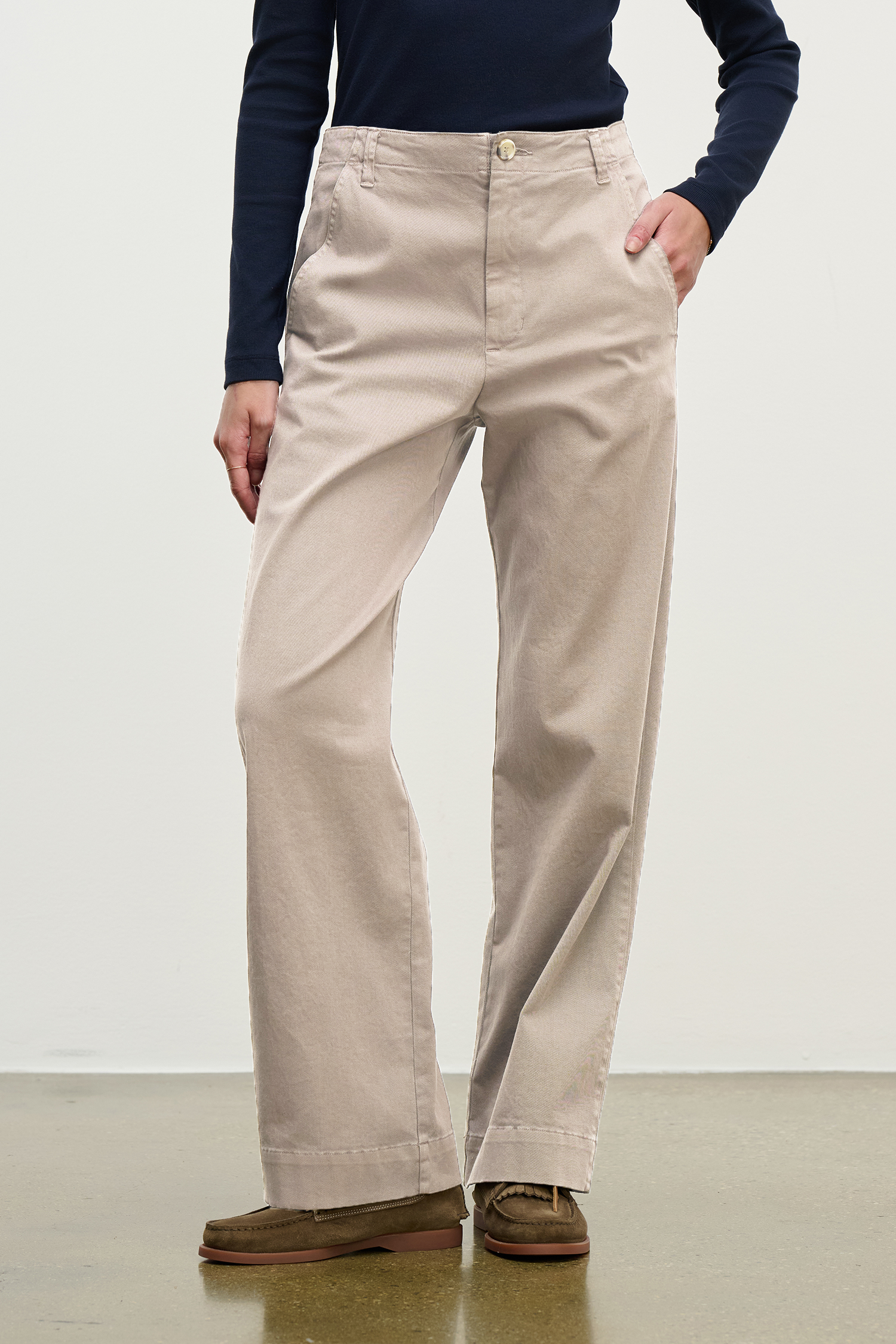 Made from structured cotton twill with a hint of stretch, this pant delivers comfort without compromising on style. Designed with a wide leg and full-length cut, it features an elastic back waistband, front button and zip closure, functional slash pockets in front, and patch pockets on the rear.