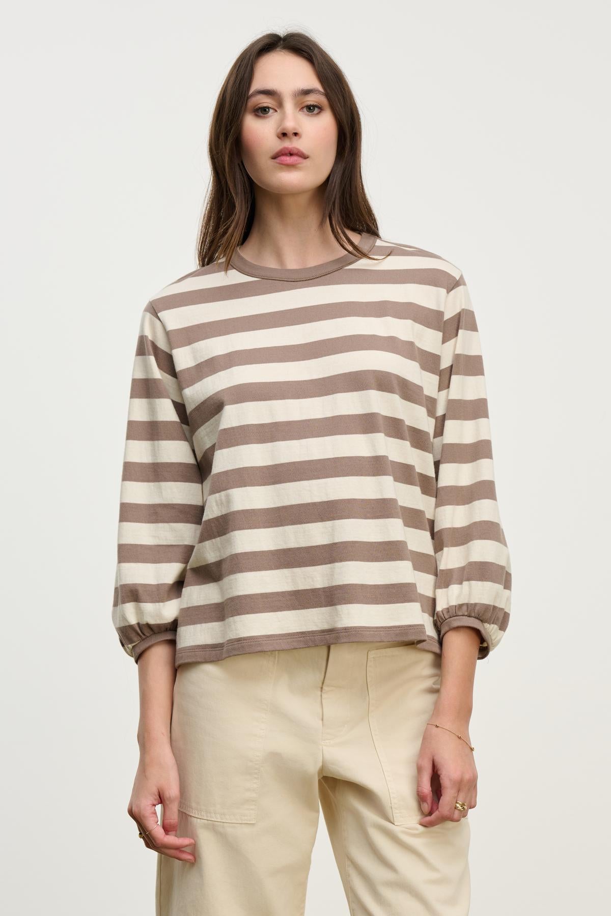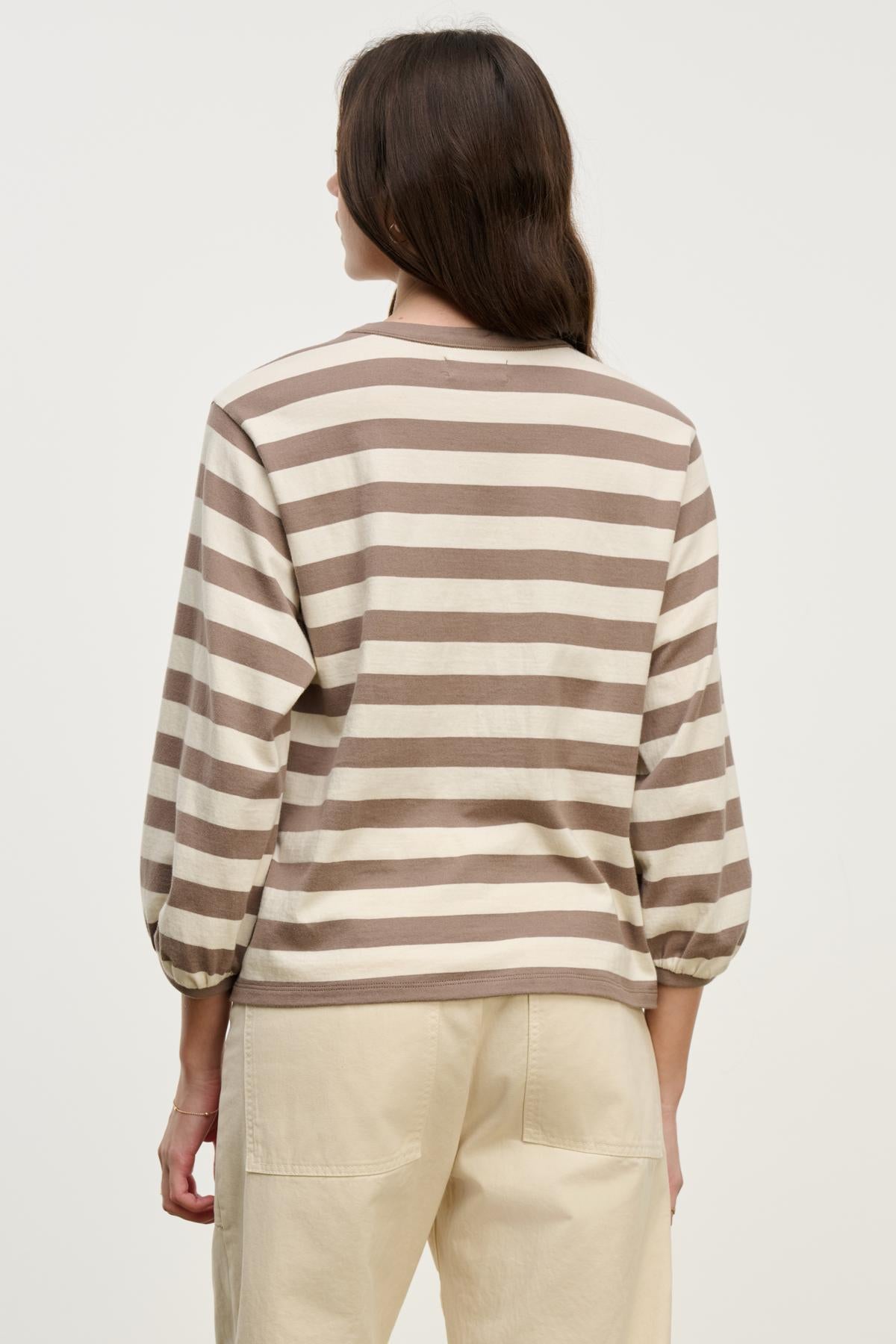 This cotton jersey top combines a timeless crew neckline with stylish 3/4 puff sleeves, adding a subtle volume that enhances its silhouette. Featuring a classic striped pattern, this piece balances casual comfort with a refined, contemporary style.
