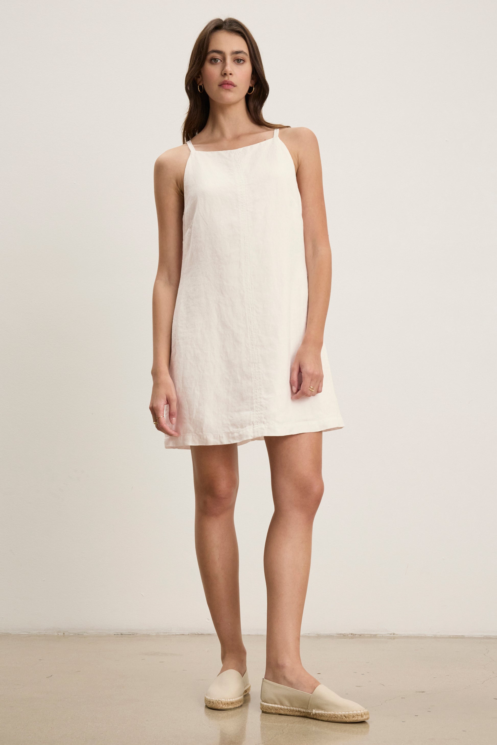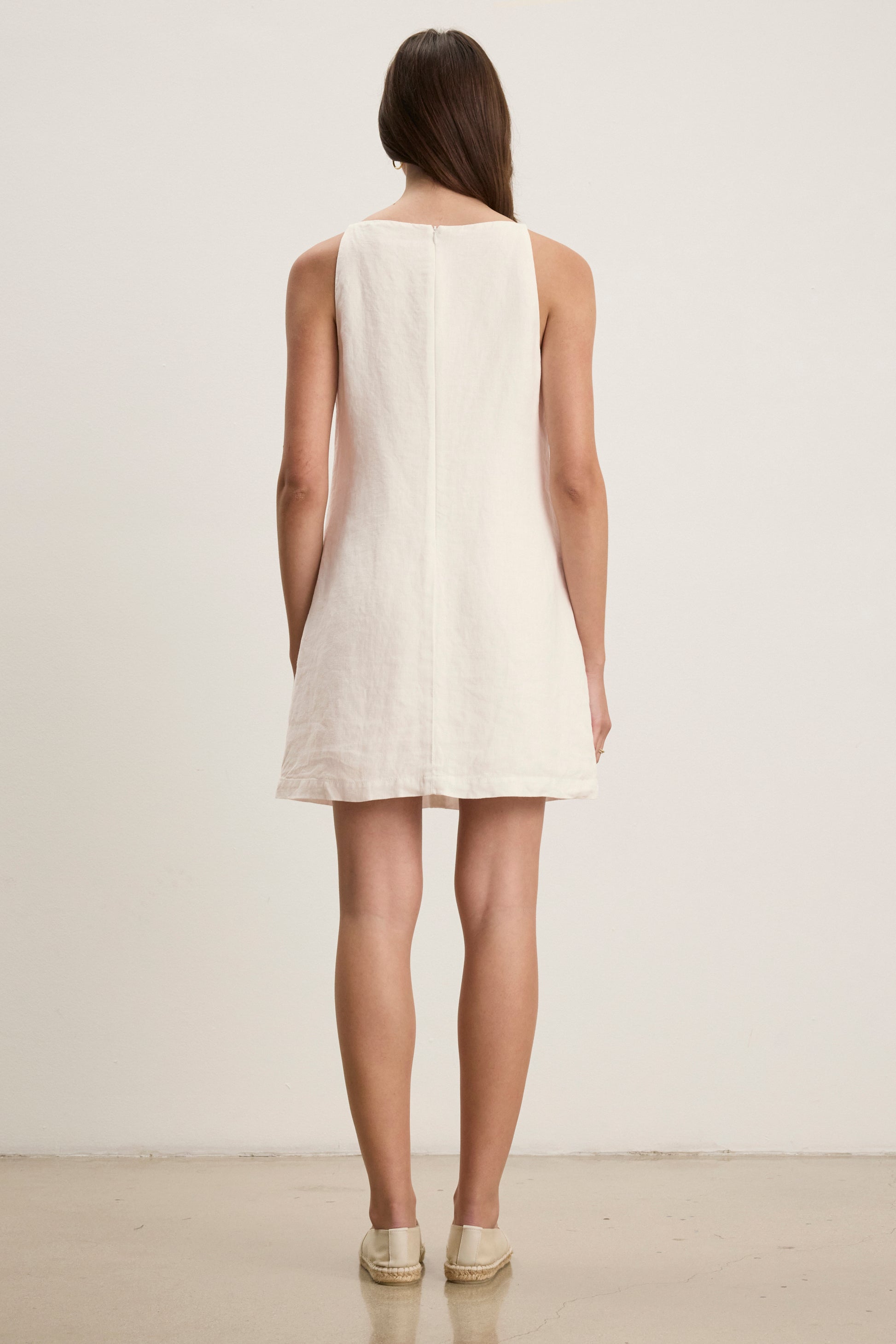 This sleek, sleeveless mini dress is designed with a flattering square neckline and a full rear zip for easy wear. Crafted from heavy linen, it offers structure and comfort while remaining fully lined for a smooth finish. Ideal for warm weather or layering.